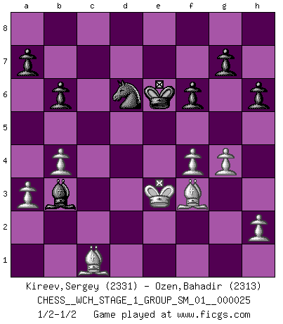 Last move : 1/2-1/2 2022 April 9 9:43:57 [Event "FICGS__CHESS__WCH_STAGE_1_GROUP_SM_01__000025"] [Site "FICGS"] [Date "2022.03.14"] [Round "1"] [White "Kireev,Sergey"] [Black "Ozen,Bahadir"] [Result "1/2-1/2"] [WhiteElo "2331"] [BlackElo "2313"] 1.d4 d5 2.c4 c6 3.Nf3 Nf6 4.e3 e6 5.b3 c5 6.cxd5 Nxd5 7.Bb2 cxd4 8.Nxd4 e5 9.Nb5 Bb4+ 10.N1c3 Be6 11.a3 Bxc3+ 12.Nxc3 Nc6 13.Nxd5 Qxd5 14.Qxd5 Bxd5 15.b4 f6 16.Be2 Ne7 17.O-O Rc8 18.Rfc1 Kf7 19.f4 exf4 20.exf4 Bb3 21.Kf2 b6 22.Rxc8 Rxc8 23.Rc1 Rxc1 24.Bxc1 Nf5 25.Bf3 Ke6 26.g4 Nd6 27.Ke3 h6 28.Kd4 Nb5+ 29.Ke3 Nd6 1/2-1/2 QGD Slav : 4.e3 Kingside Castling by player White (move 17) This chess game ended in a draw. Follow this game move after move (download)The tactician must know what to do whenever something needs doing; the strategist must know what to do when nothing needs doing. (Savielly Tartakover) Sie führen leise Selbstgespräche, schlürfen lautstark ihre Getränke, schmatzen hörbar beim Essen, blasen ihrem Gegenüber Rauch in die Augen, niesen ihm ins Gesicht, starren ihn unverwandt an, bis er sich unter ihren Blicken windet, rutschen ständig auf ihrem Stuhl hin und her, rülpsen und bohren in der Nase. (Anonymous) El Ajedrez por encima de todo... ¡es una pelea!. (Emanuel Lasker) Je ne suis pas le dernier à jouer lâchement des coups douteux pendant le zeïtnot de l'adversaire pour l'achever: en effet les coups qui font le plus peur sont ceux que l'on ne comprend pas. Je me fais souvent peur quand je joue. (Un professeur anonyme) I don't believe in psychology. I believe in good moves. (Bobby Fischer)