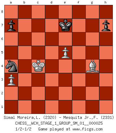 Last move : 1/2-1/2 2022 July 18 10:0:38 [Event "FICGS__CHESS__WCH_STAGE_1_GROUP_SM_01__000025"] [Site "FICGS"] [Date "2022.03.14"] [Round "1"] [White "Simal Moreira,Leonardo"] [Black "Mesquita Jr.,Fausto Monteiro"] [Result "1/2-1/2"] [WhiteElo "2320"] [BlackElo "2331"] 1.d4 Nf6 2.c4 e6 3.Nc3 Bb4 4.Qc2 O-O 5.e4 d5 6.e5 Ne4 7.Bd3 c5 8.Nge2 cxd4 9.Nxd4 Nd7 10.Bf4 Qh4 11.g3 Qh3 12.O-O-O Nxc3 13.bxc3 Ba3+ 14.Kb1 Nb6 15.Bf1 Qh5 16.Be2 Qg6 17.Bd3 f5 18.cxd5 Nxd5 19.Bc1 Bxc1 20.Rxc1 Bd7 21.Ka1 Qf7 22.Qb2 Bc6 23.f4 Rfd8 24.Bb1 g6 25.Rhg1 Kh8 26.g4 fxg4 27.Rxg4 Ne3 28.Rg5 Nc4 29.Qf2 Rg8 30.h4 Raf8 31.h5 gxh5 32.Rxg8+ Rxg8 33.Nxc6 bxc6 34.Rd1 Nb6 35.Qc5 Nd5 36.f5 Rb8 37.fxe6 Qf3 38.Rc1 Qe2 39.Rc2 Qf1 40.Rb2 Rxb2 41.Kxb2 Qb5+ 42.Qxb5 cxb5 43.Be4 Nc7 44.e7 Kg7 45.Bd5 h4 46.Be6 h3 47.Bxh3 Kf7 48.e8Q+ Nxe8 49.Kb3 Nc7 50.a3 Ke7 51.Kb4 Nd5+ 52.Kxb5 Nxc3+ 53.Kc4 Na4 54.Bg4 1/2-1/2 Nimzo-Indian : Classical variation Kingside Castling by player Black (move 4) Queenside Castling by player White (move 12) Promotion Queen by player White (move 48) 10 pieces endgame at move 48 : White KBPPP , Black KNPPP WHITE : King + 1 Bishop 3 Pawns BLACK : King + 1 Knight 3 Pawns 9 pieces endgame at move 52 : White KBPPP , Black KNPP WHITE : King + 1 Bishop 3 Pawns BLACK : King + 1 Knight 2 Pawns 8 pieces endgame at move 52 : White KBPP , Black KNPP WHITE : King + 1 Bishop 2 Pawns BLACK : King + 1 Knight 2 Pawns This chess game ended in a draw. Follow this game move after move (download)Not all artists are Chess players, but all Chess players are artists. (Marcel Duchamp) Ich rechne überhaupt nicht voraus. Ich gewinne auch so. (Robert James Fischer) Muchos jugadores de Ajedrez se sorprendÃan cuando después de la partida, Fischer explicaba con calma: 'Yo ya habÃa analizado esta posibilidad' en una posición en la cual yo creÃa que no era posible de prever desde la apertura. (Mikhail Tal) Aidez vos pièces, elles vous aideront. (Paul Morphy) Perfection is achieved, not when there is nothing more to add, but when there is nothing left to take away. (Antoine de Saint-Exupéry)
