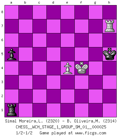 Last move : 1/2-1/2 2022 June 8 1:56:8 [Event "FICGS__CHESS__WCH_STAGE_1_GROUP_SM_01__000025"] [Site "FICGS"] [Date "2022.03.14"] [Round "1"] [White "Simal Moreira,Leonardo"] [Black "B. Oliveira,Marcio"] [Result "1/2-1/2"] [WhiteElo "2320"] [BlackElo "2314"] 1.d4 Nf6 2.c4 e6 3.Nc3 Bb4 4.Qc2 O-O 5.e4 d5 6.e5 Ne4 7.Bd3 c5 8.Nf3 cxd4 9.Nxd4 Nd7 10.Bf4 Qh4 11.g3 Qh5 12.O-O g5 13.cxd5 gxf4 14.dxe6 Nxe5 15.Nxe4 fxe6 16.gxf4 Rxf4 17.Kh1 Kh8 18.Rg1 Nxd3 19.Qxd3 Be7 20.Rac1 Bd7 21.Qg3 Rf7 22.Rc7 Bh4 23.Qg4 Qxg4 24.Rxg4 e5 25.Rxh4 exd4 26.Ng5 Re7 27.f3 Rg8 28.Re4 Rxe4 29.fxe4 Rxg5 30.Rxd7 Rc5 31.Rxd4 Rc1+ 32.Kg2 Rc2+ 33.Kg3 Rxb2 34.a3 a5 35.h4 Rb3+ 36.Kf4 Rxa3 37.Rd8+ Kg7 38.Rd7+ Kg6 39.Rxb7 Ra1 40.h5+ Kxh5 41.Rxh7+ 1/2-1/2 Nimzo-Indian : Classical variation Kingside Castling by player Black (move 4) Kingside Castling by player White (move 12) 10 pieces endgame at move 33 : White KRPPP , Black KRPPP WHITE : King + 1 Rook 3 Pawns BLACK : King + 1 Rook 3 Pawns 9 pieces endgame at move 36 : White KRPP , Black KRPPP WHITE : King + 1 Rook 2 Pawns BLACK : King + 1 Rook 3 Pawns 8 pieces endgame at move 39 : White KRPP , Black KRPP WHITE : King + 1 Rook 2 Pawns BLACK : King + 1 Rook 2 Pawns 7 pieces endgame at move 40 : White KRP , Black KRPP WHITE : King + 1 Rook 1 Pawn BLACK : King + 1 Rook 2 Pawns 6 pieces endgame at move 41 : White KRP , Black KRP WHITE : King + 1 Rook 1 Pawn BLACK : King + 1 Rook 1 Pawn This chess game ended in a draw. Follow this game move after move (download)Who is your opponent tonight, tonight I am playing against the Black pieces. (Akiba Rubinstein) Zu meiner Zeit war ein 20 jähriger ein junger Spieler, heute ist er ein Veteran. (Garry Kasparov) Un jugador que trata de regresar una movida en el Ajedrez es un futuro carterista. (Richard Fenton) La vérité est comme le meilleur coup aux échecs : elle existe, mais il faut la chercher. (Arturo Perez-Reverte) For to win one hundred victories in one hundred battles is not the acme of skill. To subdue the enemy without fighting is the acme of skill. (Sun Tzu)