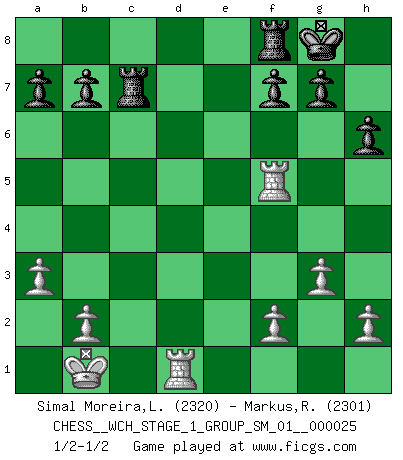 Last move : 1/2-1/2 2022 May 22 1:9:11 [Event "FICGS__CHESS__WCH_STAGE_1_GROUP_SM_01__000025"] [Site "FICGS"] [Date "2022.03.14"] [Round "1"] [White "Simal Moreira,Leonardo"] [Black "Markus,Roland"] [Result "1/2-1/2"] [WhiteElo "2320"] [BlackElo "2301"] 1.d4 Nf6 2.c4 e6 3.Nc3 Bb4 4.Qc2 d5 5.cxd5 exd5 6.Bf4 c5 7.dxc5 Nc6 8.e3 O-O 9.Nf3 d4 10.O-O-O Bxc5 11.exd4 Bd6 12.Bxd6 Qxd6 13.a3 Be6 14.d5 Nxd5 15.g3 h6 16.Nxd5 Bxd5 17.Bc4 Ne7 18.Bxd5 Nxd5 19.Kb1 Qf6 20.Rxd5 Qxf3 21.Rhd1 Rac8 22.Qf5 Qxf5+ 23.Rxf5 Rc7 1/2-1/2 Nimzo-Indian : Classical, Noa variation, 5.cd ed Kingside Castling by player Black (move 8) Queenside Castling by player White (move 10) This chess game ended in a draw. Follow this game move after move (download)The passed Pawn is a criminal, who should be kept under lock and key. Mild measures, such as police surveillance, are not sufficient. (Aaron Nimzovich) Pläne sind die Träume des Verständigen. (Ernst Freiherr von Feuchtersleben) Aquel que toma al Peón de Caballo de la Reina, se pasará la noche a dormir en la calle. (Anónimo) On a dit que l'homme se distingue de l'animal par le fait qu'il achète plus de livres qu'il ne peut en lire. Je voudrais suggérer qu'inclure à la liste des livres quelques livres d'échecs rendrait la distinction manifeste. (Edward Lasker) He who laughs last probably does not get the joke. (Unknown)