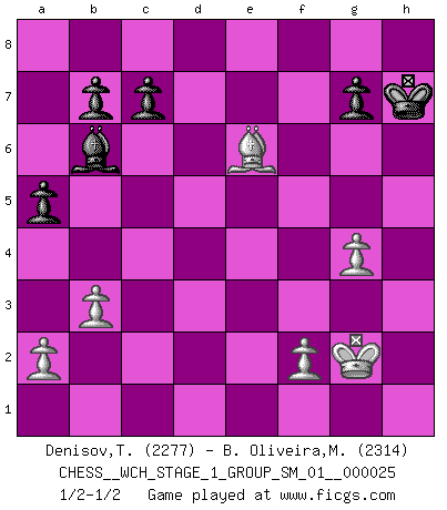 Last move : 1/2-1/2 2022 June 6 16:58:20 [Event "FICGS__CHESS__WCH_STAGE_1_GROUP_SM_01__000025"] [Site "FICGS"] [Date "2022.03.14"] [Round "1"] [White "Denisov,Timofey"] [Black "B. Oliveira,Marcio"] [Result "1/2-1/2"] [WhiteElo "2277"] [BlackElo "2314"] 1.e4 e5 2.Nf3 Nc6 3.Bc4 Bc5 4.c3 Nf6 5.d3 d6 6.O-O a5 7.Re1 O-O 8.Nbd2 Be6 9.b3 h6 10.h3 Bb6 11.Nf1 d5 12.exd5 Nxd5 13.Bd2 Qf6 14.N1h2 Rad8 15.Ng4 Bxg4 16.hxg4 e4 17.g5 hxg5 18.Bxg5 Qg6 19.dxe4 Nxc3 20.Qc2 Nd4 21.Qxc3 Nxf3+ 22.Qxf3 Qxg5 23.Rad1 Qf6 24.Qe2 Rxd1 25.Rxd1 Rd8 26.Rxd8+ Qxd8 27.e5 Qg5 28.e6 fxe6 29.Qxe6+ Kh7 30.g4 Qg6 31.Kg2 Qxe6 32.Bxe6 1/2-1/2 Giuoco Piano Kingside Castling by player White (move 6) Kingside Castling by player Black (move 7) This chess game ended in a draw. Follow this game move after move (download)When you see a good move, look for a better one. (Emanuel Lasker) Es gibt zwei Arten von Opfern: Korrekte und meine. (Mikhail Nekhemyevich Tal) El Ajedrez es parte de la cultura, y si una cultura esta en decadencia, entonces también el Ajedrez declinará. (Mikhail Botvinnik) Une platitude souvent récitée à propos des Echecs est qu'une des choses les plus difficiles à réaliser est de gagner une position gagnante. Cela ne manque pas de sens mais, pour ma part, j'ai toujours trouvé plus difficile de gagner une position perdante. (Tim Krabbe) There are two kinds of people in the world, my friend. Those who have a loaded gun and those who dig. You dig ! (Blondie in The Good, The Bad and The Ugly)