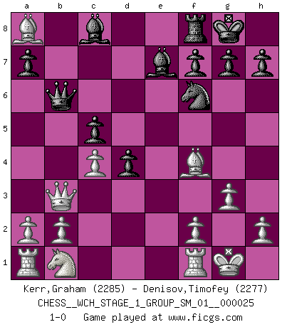 Last move : 1-0 2022 June 4 22:49:28 [Event "FICGS__CHESS__WCH_STAGE_1_GROUP_SM_01__000025"] [Site "FICGS"] [Date "2022.03.14"] [Round "1"] [White "Kerr,Graham"] [Black "Denisov,Timofey"] [Result "1-0"] [WhiteElo "2285"] [BlackElo "2277"] 1.Nf3 d5 2.d4 Nf6 3.g3 c5 4.Bg2 cxd4 5.O-O e6 6.Nxd4 e5 7.Nf3 Nc6 8.c4 d4 9.e3 Be7 10.exd4 exd4 11.Bf4 O-O 12.Ne5 Qb6 13.Nxc6 bxc6 14.Qb3 c5 15.Bxa8 1-0 Reti Opening Kingside Castling by player White (move 5) Kingside Castling by player Black (move 11) Player White won this chess game. Follow this game move after move (download)Chess, like any creative activity, can exist only through the combined efforts of those who have creative talent, and those who have the ability to organize their creative work. (Mikhail Botvinnik) Es genügt nicht ein guter Spieler zu sein, man muß auch gut spielen. (Siegbert Tarrasch) En la vida, como en el Ajedrez, los Peones propios obstruyen nuestro camino. La gran fortuna de un hombre, su comodidad, placer, hijos, libros, que deberían ayudarle a ganar, con mucha frecuencia lo ponen en Jaque Mate. (Charles Buxton) La tactique, c'est ce que vous faites quand il y a quelque chose à faire; la stratégie, c'est ce que vous faites quand il n'y a rien à faire. (Savielli Tartacower) Thibault, I ask for draw. Game 13876. - Sorry Ilmars, you won. (FICGS chat)