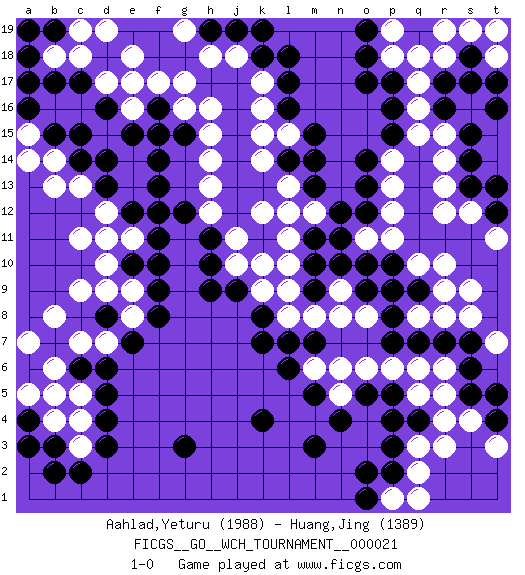 Last move : 1-0 2023 January 20 9:15:9 [Event "FICGS__GO__WCH_TOURNAMENT__000021"] [Site "FICGS"] [Date "2022.03.14"] [Round "1"] [Black "Aahlad,Yeturu"] [White "Huang,Jing"] [Result "1-0"] [Rating 1 "1988"] [Rating 2 "1389"] 1.r16 d17 2.d4 r4 3.p3 q5 4.c15 e16 5.o17 c3 6.d3 c4 7.d5 b6 8.m3 q3 9.p4 r10 10.q7 p6 11.q9 q10 12.p10 p11 13.o10 o11 14.n10 n6 15.r9 r12 16.k4 c13 17.q4 r3 18.s5 r5 19.s6 s4 20.p2 o8 21.p8 m8 22.d13 d12 23.d14 c11 24.e12 e11 25.f11 e13 26.f12 e14 27.e10 d11 28.f9 c9 29.c6 c5 30.b7 c7 31.d6 b8 32.c17 c18 33.d16 e17 34.e15 f15 35.f14 d15 36.o5 o6 37.e15 q16 38.f13 q17 39.r17 r18 40.s18 q18 41.s13 r15 42.s15 r14 43.s14 r13 44.n11 k16 45.l16 l15 46.m15 k15 47.p15 q15 48.m14 s19 49.s17 s12 50.t13 p14 51.o14 p13 52.l17 k17 53.c2 a7 54.l7 l8 55.k8 k9 56.k7 l10 57.g15 g17 58.b3 b4 59.f16 f17 60.j9 j10 61.k11 k10 62.m9 n9 63.a4 b5 64.m10 l9 65.b2 q2 66.k18 j18 67.l18 h16 68.h9 e8 69.d8 d7 70.e7 d9 71.f8 e9 72.b17 b18 73.j19 h18 74.m5 l11 75.o12 p12 76.o9 n8 77.o13 r6 78.r7 s8 79.s7 s9 80.o18 b14 81.b15 p1 82.o1 q1 83.o2 m6 84.p5 q6 85.l6 n5 86.n4 r8 87.p16 q8 88.p7 p9 89.q9 m12 90.n12 k12 91.h11 j11 92.h10 h12 93.m13 l13 94.a18 a15 95.c14 b13 96.a16 a14 97.t16 h14 98.g12 h13 99.l14 k14 100.t12 t11 101.m11 l12 102.h19 g19 103.k19 p19 104.o19 a5 105.a3 d10 106.f10 h15 107.t4 t3 108.t5 t7 109.m7 p18 110.d18 e18 111.b19 d19 112.a17 c19 113.a19 g16 114.f15 r9 115.p9 t18 116.t17 r19 117.p17 t19 118.g3 1-0 Here are the names of the openings (joseki) played in the four corners : Corner q4 : r4 p3 Komoku (Somok, Xiao~mu`) 3-4 Point. The komoku (3-4) point is the traditional corner enclosure move.. Ikken Kakari (Hankan Keolch'im, Yi Gua`jiao~, 1-Space Low Pincer). The small knight move is the basic approach move to the 3-4 point stone. It has been continually used for over four centuries. There are limitless variations, with new moves constantly being discovered. Black 2 opens the door to a treaure store of joseki. Corner d16 : d17 c15 Komoku (Somok, Xiao~mu`) 3-4 Point. The komoku (3-4) point is the traditional corner enclosure move.. Ikken Kakari (Hankan Keolch'im, Yi Gua`jiao~, 1-Space Low Pincer). The small knight move is the basic approach move to the 3-4 point stone. It has been continually used for over four centuries. There are limitless variations, with new moves constantly being discovered. Black 2 opens the door to a treaure store of joseki. Corner d4 : d4 c3 Hoshi (Hwajeom, Seongjeom, Xingwei`) 4-4 Point. The star or hoshi (4-4) point, emphasizing influence at the potential expense of territory. Player Black won this Go (weiqi, baduk) game. Follow this game move after move (download)There is death in the hane. (Anonymous) Always be a first-rate version of yourself, instead of a second-rate version of somebody else. (Judy Garland)