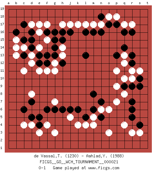 Last move : 0-1 2022 May 25 18:37:41 [Event "FICGS__GO__WCH_TOURNAMENT__000021"] [Site "FICGS"] [Date "2022.03.14"] [Round "1"] [Black "de Vassal,Thibault"] [White "Aahlad,Yeturu"] [Result "0-1"] [Rating 1 "1230"] [Rating 2 "1988"] 1.q16 q4 2.d16 d4 3.r6 o3 4.s4 r3 5.q9 r17 6.r16 q17 7.p17 p18 8.o17 o18 9.n18 n17 10.n16 m17 11.m16 l17 12.l16 k17 13.l13 r11 14.r12 q12 15.q11 r10 16.r13 q10 17.r9 p11 18.p13 p9 19.s9 g3 20.c6 p7 21.f6 q13 22.q14 d8 23.d5 c4 24.e4 e3 25.h6 f4 26.e5 c11 27.c13 b15 28.c15 b14 29.b16 c14 30.d14 b13 31.k6 d13 32.e13 d12 33.e12 e11 34.j16 e14 35.d15 j17 36.h16 h17 37.g16 g7 38.g6 s3 39.r5 q8 40.s10 s11 41.r7 k4 42.d7 g11 43.f12 g12 44.g13 h13 45.g14 j5 46.j6 m5 47.m6 n6 48.l5 l4 49.n5 m4 50.n7 o6 51.m8 f11 52.f13 h14 53.h15 f15 54.g15 f17 55.f16 e17 56.h12 d17 57.c17 e16 0-1 Here are the names of the openings (joseki) played in the four corners : Corner q4 : q4 r6 Hoshi (Hwajeom, Seongjeom, Xingwei`) 4-4 Point. The star or hoshi (4-4) point, emphasizing influence at the potential expense of territory. Ikken Kakari (Hankan Keolch'im, Yi Gua`jiao~, 1-Space Low Approach). Black 2 is the standard approach move to the 4-4. Corner q16 : q16 r17 Hoshi (Hwajeom, Seongjeom, Xingwei`) 4-4 Point. The star or hoshi (4-4) point, emphasizing influence at the potential expense of territory. Corner d16 : d16 c11 Hoshi (Hwajeom, Seongjeom, Xingwei`) 4-4 Point. The star or hoshi (4-4) point, emphasizing influence at the potential expense of territory. Player White won this Go (weiqi, baduk) game. Follow this game move after move (download)Keep sente in the opening. A premature attack loses sente. (Anonymous) Patience, use the Force, think ! (Obi-Wan Kenobi in Star Wars ep.2)