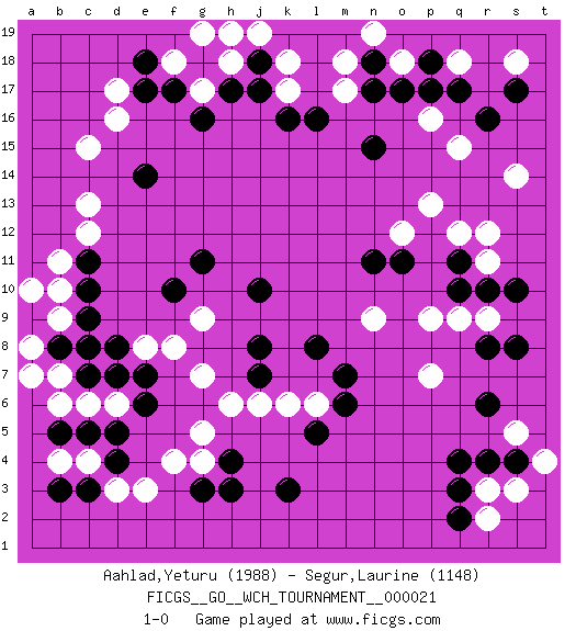 Last move : 1-0 2022 July 29 12:20:5 [Event "FICGS__GO__WCH_TOURNAMENT__000021"] [Site "FICGS"] [Date "2022.03.14"] [Round "1"] [Black "Aahlad,Yeturu"] [White "Segur,Laurine"] [Result "1-0"] [Rating 1 "1988"] [Rating 2 "1148"] 1.r16 d16 2.q4 d3 3.c5 c4 4.d5 g4 5.d8 c13 6.e14 c15 7.e17 d17 8.o17 r3 9.r4 s3 10.q3 r2 11.r6 r9 12.q2 s5 13.s4 t4 14.s8 r12 15.r8 s14 16.k3 b10 17.d4 e3 18.c3 b4 19.b3 b6 20.b5 c8 21.h3 h6 22.h4 g5 23.g3 d6 24.e6 m18 25.j17 o18 26.n17 k18 27.n18 n19 28.l16 h18 29.j18 j19 30.h17 f18 31.g18 h19 32.f17 q18 33.q17 s18 34.s17 p9 35.q11 r11 36.q10 q9 37.r10 p7 38.s10 q15 39.p18 p13 40.o11 p16 41.p17 g19 42.e18 g17 43.g16 k17 44.k16 m17 45.n15 o12 46.n11 q12 47.m7 n9 48.j8 k6 49.l8 g7 50.j7 j6 51.l5 f8 52.c9 b9 53.c7 c6 54.e7 e8 55.b8 b7 56.c10 a8 57.c8 b11 58.c11 c12 59.f10 l6 60.m6 f4 61.d7 a7 62.a9 a10 63.g11 g9 64.j10 1-0 Here are the names of the openings (joseki) played in the four corners : Corner d4 : d3 c5 Komoku (Somok, Xiao~mu`) 3-4 Point. The komoku (3-4) point is the traditional corner enclosure move.. Ikken Kakari (Hankan Keolch'im, Yi Gua`jiao~, 1-Space Low Pincer). The small knight move is the basic approach move to the 3-4 point stone. It has been continually used for over four centuries. There are limitless variations, with new moves constantly being discovered. Black 2 opens the door to a treaure store of joseki. Corner q4 : q4 r3 Hoshi (Hwajeom, Seongjeom, Xingwei`) 4-4 Point. The star or hoshi (4-4) point, emphasizing influence at the potential expense of territory. Player Black won this Go (weiqi, baduk) game. Follow this game move after move (download)Error is one of the sources of transformation. (Pierre Audouard) A bird doesn't sing because it has an answer, it sings because it has a song. (Maya Angelou)