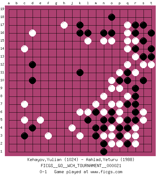 Last move : 0-1 2022 July 2 1:5:16 [Event "FICGS__GO__WCH_TOURNAMENT__000021"] [Site "FICGS"] [Date "2022.03.14"] [Round "1"] [Black "Kehayov,Yulian"] [White "Aahlad,Yeturu"] [Result "0-1"] [Rating 1 "1024"] [Rating 2 "1988"] 1.c3 q16 2.q4 d16 3.d10 c14 4.s10 r3 5.r17 q17 6.r16 q15 7.r14 q3 8.p4 r4 9.r5 s5 10.r6 s6 11.r7 o3 12.p3 p2 13.k16 r15 14.s15 s16 15.s17 s14 16.t16 r13 17.t14 q14 18.s13 s12 19.r14 h17 20.k17 s14 21.t13 r11 22.r9 t12 23.r14 o4 24.o5 p5 25.q5 p6 26.o6 p7 27.p8 o7 28.n7 n8 29.o8 m7 30.m6 n6 31.n5 m5 32.n4 n3 33.m4 l6 34.l5 o10 35.p10 p11 36.q10 q8 37.q7 p9 38.r8 o9 39.q11 q12 40.m6 k6 41.m3 j4 42.n2 o2 43.n1 k3 44.q2 r2 45.k11 f3 46.o16 n15 47.n16 o15 48.o18 l15 49.l16 c5 50.d4 c7 51.d12 e5 0-1 This go game has been lost on time (started : 2022.03.14 21:28:18) Here are the names of the openings (joseki) played in the four corners : Corner q4 : q4 r3 Hoshi (Hwajeom, Seongjeom, Xingwei`) 4-4 Point. The star or hoshi (4-4) point, emphasizing influence at the potential expense of territory. Corner q16 : q16 r17 Hoshi (Hwajeom, Seongjeom, Xingwei`) 4-4 Point. The star or hoshi (4-4) point, emphasizing influence at the potential expense of territory. Corner d4 : c3 j4 San-San (Sam-Sam, San-San) 3-3 Point. The San-San (3-3) point, emphasizing territory at the expense of influence. Player White won this Go (weiqi, baduk) game. Follow this game move after move (download)To invade, need 20 points in open area; otherwise, keshi is best. (Yang Yilun, 7p) Some people are so afraid to die that they never begin to live. (Henry Van Dyke)