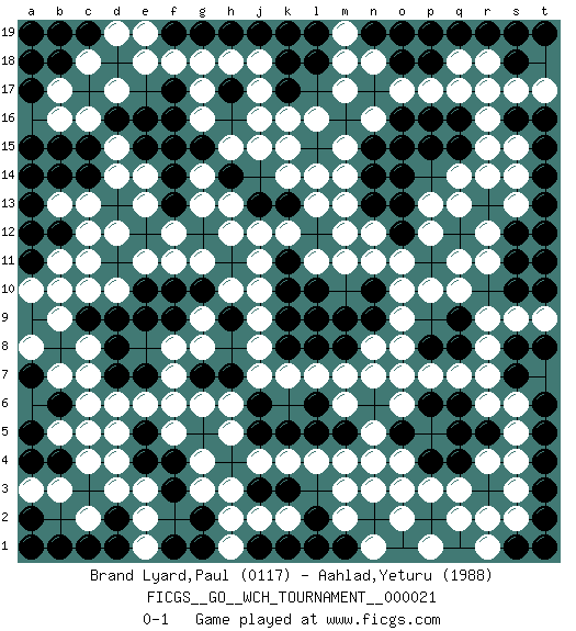 Last move : 0-1 2022 October 10 1:29:46 [Event "FICGS__GO__WCH_TOURNAMENT__000021"] [Site "FICGS"] [Date "2022.03.14"] [Round "1"] [Black "Brand Lyard,Paul"] [White "Aahlad,Yeturu"] [Result "0-1"] [Rating 1 "0117"] [Rating 2 "1988"] 1.s18 r4 2.q4 q3 3.s1 p3 4.k10 d4 5.c3 d3 6.e4 c4 7.c5 d5 8.e5 d6 9.d7 e6 10.f6 f7 11.e16 g6 12.g7 c16 13.c17 c12 14.r3 s3 15.e7 f8 16.f16 f5 17.g5 h5 18.n13 p17 19.k11 r17 20.l15 m17 21.n17 n16 22.g12 b17 23.n10 d17 24.h16 e11 25.e12 r14 26.h7 l4 27.p18 o17 28.o18 n18 29.p4 r2 30.f17 f11 31.b12 c11 32.d18 c18 33.t3 d14 34.c14 c13 35.b14 d15 36.s10 r7 37.d2 c2 38.p11 m3 39.g2 h3 40.h17 o7 41.k8 l7 42.b4 b3 43.o14 r16 44.s16 s15 45.h14 r9 46.k17 q11 47.b8 b10 48.j13 q10 49.j19 p12 50.q12 p13 51.l2 k7 52.l12 h6 53.g10 n8 54.f19 g11 55.m5 h10 56.d9 c6 57.b6 b5 58.s12 o11 59.c19 e18 60.q19 r18 61.r19 j8 62.o1 f18 63.g15 g18 64.j1 h2 65.l19 m19 66.k13 h12 67.t6 o10 68.p8 s6 69.o5 o3 70.l9 j9 71.p15 q14 72.a9 h18 73.a7 c7 74.t8 g13 75.e9 m15 76.f1 l16 77.a19 m13 78.q6 l14 79.m1 j15 80.a15 m11 81.q1 m12 82.b1 r8 83.t13 s9 84.k5 m4 85.f14 g17 86.f3 h1 87.d1 e2 88.a13 b13 89.n6 m7 90.k3 k4 91.c9 j18 92.g19 s17 93.a17 d19 94.t14 e13 95.f4 g4 96.q9 s5 97.h9 j7 98.n9 o9 99.l6 r1 100.n2 n3 101.t11 s13 102.p2 g16 103.f9 b9 104.a2 j12 105.k1 j2 106.t19 k14 107.o19 m2 108.q16 c10 109.h4 c8 110.n15 k12 111.r5 n7 112.m8 p7 113.h11 j11 114.m9 j10 115.a11 q17 116.o16 b7 117.p6 o4 118.l18 k16 119.o12 b16 120.d8 n11 121.t10 l13 122.t16 r15 123.g1 e1 124.j5 j4 125.b19 r12 126.k18 t17 127.b15 p10 128.b18 f12 129.j6 d12 130.e10 q13 131.t4 h13 132.t2 n4 133.f13 g8 134.a5 e3 135.s8 j17 136.n19 m18 137.s7 s2 138.s11 q18 139.h19 e19 140.q8 q2 141.k19 s4 142.t15 o2 143.a4 s14 144.e15 e14 145.a18 o6 146.p19 k15 147.c1 g9 148.j3 r11 149.k9 r6 150.d16 c5 151.t5 h15 152.n14 t9 153.a12 f6 154.s19 a3 155.o15 a10 156.l10 l11 157.p16 g3 158.o13 g14 159.a1 j16 160.q5 n5 161.f10 q7 162.h17 d10 163.c15 a8 164.q15 m6 165.l5 p1 166.l8 n1 167.t1 o8 168.l1 m14 169.f15 k2 170.a14 n12 171.t12 b11 172.pass pass 173.pass 0-1 Here are the names of the openings (joseki) played in the four corners : Corner q4 : r4 q4 Komoku (Somok, Xiao~mu`) 3-4 Point. The komoku (3-4) point is the traditional corner enclosure move.. Corner d4 : d4 c3 Hoshi (Hwajeom, Seongjeom, Xingwei`) 4-4 Point. The star or hoshi (4-4) point, emphasizing influence at the potential expense of territory. Corner d16 : e16 c16 Takamoku (Gomok, Gaomu`) 5-4 Point. The takamoku (high) point (5-4). With its emphasis on influence, the 5-4 point complements the 4-4 (hoshi) point in creating an influence-oriented fuseki. Komoku. Black responds with 3-3, 3-5, 4-6, 4-7, 3-6, 3-7. Player White won this Go (weiqi, baduk) game. Follow this game move after move (download)The weak player fears ko, the strong player seeks it. (Bill Taylor) Methinks King Thibault should dub Marius Zubac a knight of the square board... I mean table, henceforth addressing him as Sir Marius, and bestow on him a suitable land from the kingdom of FICGS & marry him off to a worthy, fair maiden, lest he slice our heads with his mighty sword in his wrath. (Dinesh De Silva)