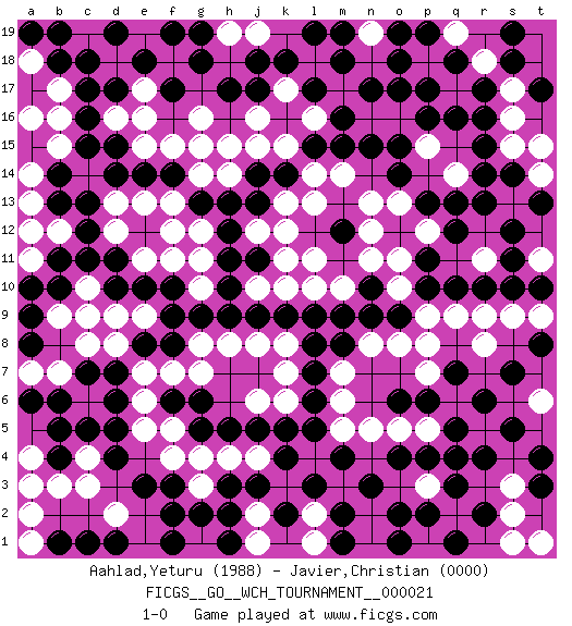 Last move : 1-0 2023 February 7 1:53:52 [Event "FICGS__GO__WCH_TOURNAMENT__000021"] [Site "FICGS"] [Date "2022.03.14"] [Round "1"] [Black "Aahlad,Yeturu"] [White "Javier,Christian"] [Result "1-0"] [Rating 1 "1988"] [Rating 2 "0000"] 1.r16 c4 2.q4 d16 3.e3 q15 4.q16 p15 5.o17 o16 6.n17 p17 7.p16 q17 8.r17 r18 9.r15 r14 10.s14 s13 11.o15 n16 12.r13 q14 13.q13 p14 14.o14 o13 15.p13 m17 16.m16 n18 17.o18 l16 18.m15 m14 19.l15 k17 20.d5 p18 21.o19 l18 22.c5 n19 23.n15 k15 24.k14 j16 25.r6 k13 26.j14 s17 27.p19 q19 28.q18 s16 29.s18 t15 30.s12 t18 31.s19 t14 32.m8 s15 33.t13 l14 34.j13 l13 35.j11 j15 36.j9 j12 37.h12 t19 38.t17 k12 39.g13 h14 40.h13 j10 41.h10 k10 42.k9 l11 43.l9 k11 44.h11 m10 45.m12 n12 46.o12 n13 47.n9 o11 48.n10 n11 49.l3 f13 50.d10 g10 51.g9 p12 52.p11 f12 53.c12 g11 54.f14 g15 55.d15 q11 56.p10 o10 57.o9 p9 58.q10 q9 59.r10 r9 60.r4 r11 61.s10 s9 62.s11 t9 63.d4 f15 64.e14 e13 65.c16 e15 66.d14 d13 67.c13 g14 68.d17 g12 69.h9 e16 70.c18 c14 71.c15 b15 72.g18 b16 73.b14 b17 74.c17 a14 75.n3 p8 76.s7 o8 77.m9 n8 78.j18 g8 79.f8 h8 80.l6 m7 81.l7 m6 82.l5 j8 83.f17 k8 84.k18 e17 85.e18 h15 86.l19 m19 87.m18 k7 88.l8 l4 89.m4 m5 90.k4 n5 91.o4 l10 92.f9 e9 93.e10 d9 94.b5 c9 95.a8 f7 96.e8 c8 97.b10 g7 98.g5 e7 99.f10 f11 100.o6 k6 101.j5 j6 102.h5 e6 103.f6 f5 104.g6 j4 105.j3 e5 106.f2 q17 107.p17 f4 108.f3 h4 109.c7 c10 110.c11 d8 111.d7 e11 112.d11 d12 113.k5 g4 114.h3 g3 115.g2 j19 116.h17 h19 117.g19 b7 118.b6 g1 119.h1 o5 120.p6 p5 121.q5 p7 122.q7 r8 123.p4 j1 124.f1 a13 125.b18 a18 126.a17 a16 127.b19 c3 128.b4 b3 129.c1 b12 130.b11 b9 131.a9 a7 132.a6 a3 133.b1 d2 134.d1 j2 135.k2 c6 136.d6 l2 137.m2 l1 138.m1 n2 139.o2 n1 140.o1 a12 141.t8 q14 142.l17 n19 143.m19 p3 144.q3 a11 145.a10 t6 146.s5 r12 147.q12 s3 148.t4 s2 149.r2 q2 150.q1 a2 151.p2 s1 152.t3 a4 153.b13 g16 154.j17 e19 155.d19 p15 156.f19 t11 157.t10 r11 158.r14 t1 159.h2 a1 160.a19 1-0 Here are the names of the openings (joseki) played in the four corners : Corner d4 : c4 e3 Komoku (Somok, Xiao~mu`) 3-4 Point. The komoku (3-4) point is the traditional corner enclosure move.. Ikken Kakari (Hankan Keolch'im, Yi Gua`jiao~, 1-Space Low Pincer). The small knight move is the basic approach move to the 3-4 point stone. It has been continually used for over four centuries. There are limitless variations, with new moves constantly being discovered. Black 2 opens the door to a treaure store of joseki. Corner q16 : r16 q15 Komoku (Somok, Xiao~mu`) 3-4 Point. The komoku (3-4) point is the traditional corner enclosure move.. Player Black won this Go (weiqi, baduk) game. Follow this game move after move (download)You have to like to win, and to learn to recognize the errors that gave you the victory. (Pierre Audouard) A clear conscience is usually the sign of a bad memory. (Unknown)