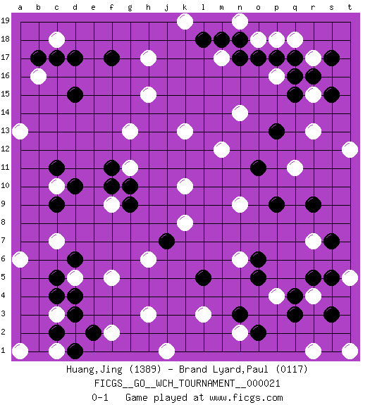 Last move : 0-1 2022 June 5 11:15:55 [Event "FICGS__GO__WCH_TOURNAMENT__000021"] [Site "FICGS"] [Date "2022.03.14"] [Round "1"] [Black "Huang,Jing"] [White "Brand Lyard,Paul"] [Result "0-1"] [Rating 1 "1389"] [Rating 2 "0117"] 1.q16 p16 2.q15 r15 3.r16 r17 4.q17 q18 5.p17 p18 6.o17 o18 7.n17 f5 8.o6 n6 9.o5 c3 10.d15 l3 11.n3 n2 12.o2 k10 13.d10 r7 14.r5 r4 15.q4 p4 16.q3 h3 17.d4 d5 18.c4 q11 19.r9 c18 20.c17 m17 21.n18 n19 22.m18 g11 23.g9 f9 24.f10 g13 25.g10 r13 26.s17 c10 27.c11 n9 28.p9 f2 29.d3 h6 30.c5 h17 31.d17 b16 32.b17 t1 33.s5 t5 34.s7 c7 35.c9 n14 36.p13 a1 37.e2 d2 38.c2 c1 39.d1 a6 40.d6 r1 41.s3 t12 42.s15 j1 43.l5 k13 44.f17 k19 45.l18 m12 46.o11 k8 47.j7 h15 48.f11 a13 0-1 Here are the names of the openings (joseki) played in the four corners : Corner q16 : q16 p16 Hoshi (Hwajeom, Seongjeom, Xingwei`) 4-4 Point. The star or hoshi (4-4) point, emphasizing influence at the potential expense of territory. Corner q4 : o6 n6 This joseki is unknown. A weak or weird move has probably been played in this corner. Corner d16 : d15 c18 Takamoku (Gomok, Gaomu`) 5-4 Point. The takamoku (high) point (5-4). With its emphasis on influence, the 5-4 point complements the 4-4 (hoshi) point in creating an influence-oriented fuseki. Player White won this Go (weiqi, baduk) game. Follow this game move after move (download)Don't defend - extend ! (Bill Taylor) Convictions are more dangerous enemies of truth than lies. (Friedrich Nietzsche)