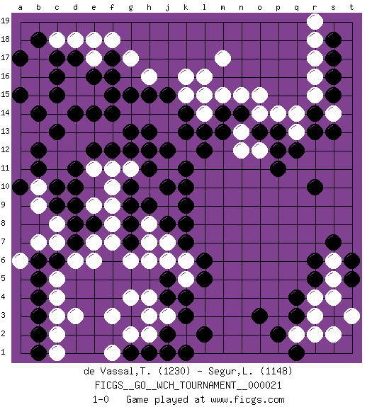 Last move : 1-0 2022 October 27 3:41:40 [Event "FICGS__GO__WCH_TOURNAMENT__000021"] [Site "FICGS"] [Date "2022.03.14"] [Round "1"] [Black "de Vassal,Thibault"] [White "Segur,Laurine"] [Result "1-0"] [Rating 1 "1230"] [Rating 2 "1148"] 1.k10 r16 2.q4 d3 3.r10 g4 4.k4 d16 5.r14 o15 6.p13 j3 7.k3 h7 8.k7 h10 9.c10 c8 10.c13 b15 11.b14 b10 12.b11 b9 13.a15 b16 14.c15 g17 15.c16 b17 16.c17 c18 17.d17 e18 18.n14 k16 19.l15 m17 20.d9 e6 21.d8 c7 22.d7 d6 23.j12 r3 24.q3 r4 25.r5 s5 26.r6 s6 27.s7 q2 28.p2 s2 29.o3 j14 30.k14 j13 31.k13 k2 32.l2 k15 33.j4 h3 34.e16 d15 35.e14 e15 36.f15 e17 37.f16 h16 38.h12 j11 39.k11 o14 40.o13 m15 41.m14 l16 42.h13 s14 43.s15 r15 44.s13 q14 45.r13 p14 46.s16 r17 47.s17 r18 48.g7 g6 49.g8 h8 50.g9 e7 51.h9 j9 52.j8 j7 53.k8 j6 54.e8 q13 55.q12 a16 56.b18 d18 57.a17 k6 58.l6 k5 59.l5 l14 60.l13 l15 61.j15 h14 62.h15 g14 63.g15 f13 64.j5 h6 65.j2 h2 66.k1 n15 67.s18 r19 68.h1 g2 69.g1 f1 70.j1 f3 71.c9 e13 72.d14 c11 73.d11 c12 74.b12 d12 75.e12 d13 76.f12 e11 77.d10 f11 78.g12 g11 79.g10 f8 80.f14 f7 81.h11 k12 82.l12 f9 83.j10 f10 84.k9 e9 85.g13 n13 86.m13 n12 87.p11 o12 88.p12 h4 89.f17 f18 90.q1 r2 91.t6 t3 92.t5 s4 93.c6 b7 94.b6 a6 95.b5 c4 96.b4 c5 97.b3 c3 98.b2 c2 99.b1 c1 100.a10 1-0 Here are the names of the openings (joseki) played in the four corners : Corner q16 : r16 r14 Komoku (Somok, Xiao~mu`) 3-4 Point. The komoku (3-4) point is the traditional corner enclosure move.. Corner d16 : d16 c13 Hoshi (Hwajeom, Seongjeom, Xingwei`) 4-4 Point. The star or hoshi (4-4) point, emphasizing influence at the potential expense of territory. Niken Kakari (Dukan Keolch'im, E`r Gua`jiao~, 2-Space Low Approach). White typically answers by 7-3 or 3-5 (which is not joseki). Corner q4 : q4 r3 Hoshi (Hwajeom, Seongjeom, Xingwei`) 4-4 Point. The star or hoshi (4-4) point, emphasizing influence at the potential expense of territory. Player Black won this Go (weiqi, baduk) game. Follow this game move after move (download)Only amateurs try to come up with fancy moves. (Anonymous) A government big enough to give you everything you want is strong enough to take everything you have. (Thomas Jefferson)