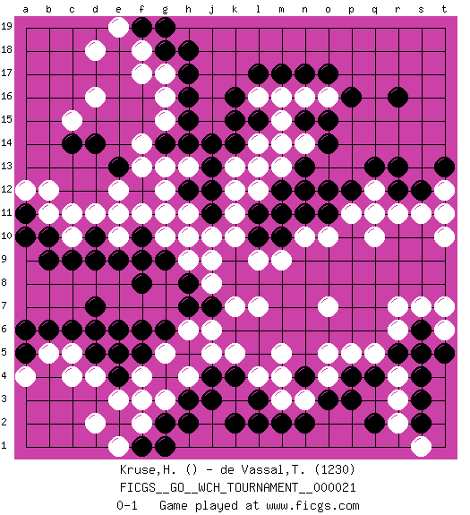 Last move : 0-1 2022 July 10 5:50:53 [Event "FICGS__GO__WCH_TOURNAMENT__000021"] [Site "FICGS"] [Date "2022.03.14"] [Round "1"] [Black "Kruse,Herbert"] [White "de Vassal,Thibault"] [Result "0-1"] [Rating 2 "1230"] 1.r16 d16 2.q4 d4 3.c6 c5 4.d7 f3 5.c14 c11 6.o3 e11 7.e9 c15 8.d14 f17 9.k16 f13 10.h17 g16 11.h15 g15 12.g14 f14 13.p16 q10 14.r12 q12 15.q13 r11 16.p12 q11 17.r13 r7 18.d5 e5 19.d6 c4 20.l3 m13 21.o14 m15 22.m17 m11 23.c9 p11 24.h3 o7 25.r5 l7 26.g9 j8 27.h14 h10 28.g18 f18 29.g2 f2 30.b6 b5 31.b10 b11 32.k14 k13 33.f12 e12 34.j13 k12 35.e13 g12 36.s12 s11 37.s6 s7 38.o12 m5 39.a11 a12 40.a10 b12 41.f19 e19 42.g19 d18 43.f1 e1 44.g1 d2 45.h12 g11 46.j11 h11 47.j12 k10 48.f6 n16 49.n17 o16 50.o17 j5 51.f5 f4 52.h7 r6 53.s5 p5 54.j7 k7 55.o15 l14 56.h8 j9 57.p4 o5 58.k15 l4 59.k2 g3 60.h2 m3 61.m2 k3 62.l2 n3 63.n2 o4 64.k4 k5 65.j4 h4 66.j3 c10 67.b9 t12 68.t13 g17 69.h18 g5 70.d10 d11 71.e6 g13 72.e4 e3 73.f10 f11 74.o11 o10 75.n13 e10 76.d9 g10 77.n11 n10 78.m12 l12 79.n12 k11 80.n15 m16 81.m14 n14 82.n4 m4 83.m14 l13 84.l15 n14 85.m10 m14 86.l11 m9 87.l10 l9 88.m11 f9 89.f8 h9 90.f10 h13 91.f9 j10 92.j14 q5 93.p3 h6 94.t11 t10 95.g6 j6 96.h16 t6 97.t5 t7 98.a5 a4 99.a6 r4 100.s4 r3 101.s3 r2 102.s2 s1 103.q2 l16 104.l17 t12 105.e5 t11 106.pass pass 0-1 Here are the names of the openings (joseki) played in the four corners : Corner d4 : d4 c6 Hoshi (Hwajeom, Seongjeom, Xingwei`) 4-4 Point. The star or hoshi (4-4) point, emphasizing influence at the potential expense of territory. Ikken Kakari (Hankan Keolch'im, Yi Gua`jiao~, 1-Space Low Approach). Black 2 is the standard approach move to the 4-4. Corner d16 : d16 c14 Hoshi (Hwajeom, Seongjeom, Xingwei`) 4-4 Point. The star or hoshi (4-4) point, emphasizing influence at the potential expense of territory. Ikken Kakari (Hankan Keolch'im, Yi Gua`jiao~, 1-Space Low Approach). Black 2 is the standard approach move to the 4-4. Player White won this Go (weiqi, baduk) game. Follow this game move after move (download)Beginner's games are surprising, often incoherent and incomprehensible. When you improve, your game gains in consistency but flirts with stupidity: you become satisfied with truisms and mechanical movements, you try to obtain a feeling for clearness and style the easy way. (Pierre Audouard) Gambling is the son of avarice and the father of despair. (French proverb)