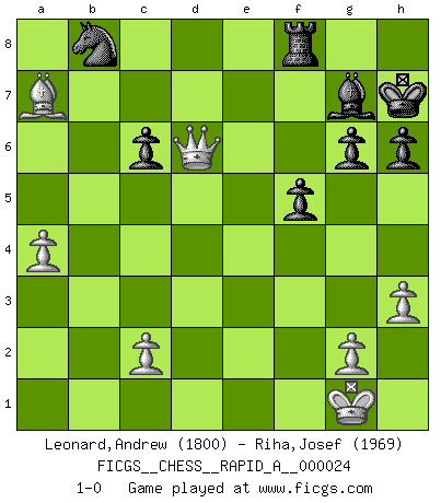 Last move : 1-0 2007 September 19 16:41:15 [Event "FICGS__CHESS__RAPID_A__000024"] [Site "FICGS"] [Date "2007.07.31"] [Round "1"] [White "Leonard,Andrew"] [Black "Riha,Josef"] [Result "1-0"] [WhiteElo "1800"] [BlackElo "1969"] 1.e4 d6 2.d4 Nf6 3.Nc3 g6 4.Nf3 Bg7 5.Be2 O-O 6.O-O c6 7.h3 Qc7 8.Be3 b5 9.e5 dxe5 10.dxe5 Nfd7 11.e6 fxe6 12.a4 b4 13.Ne4 Nf6 14.Nxf6+ exf6 15.Qd2 a5 16.Bc4 Kh8 17.Rad1 Ba6 18.Qe2 e5 19.Rd2 Qf7 20.Bxa6 Nxa6 21.Rfd1 e4 22.Nd4 Nb8 23.f3 exf3 24.Qxf3 f5 25.Nb5 Qe7 26.Bf2 Qf7 27.Bc5 Rg8 28.Nd6 Qc7 29.Qb3 h6 30.Qe6 Kh7 31.Nf7 Qc8 32.Qc4 Re8 33.Qh4 Qc7 34.Ng5+ Kh8 35.Bf2 Ra7 36.Rd8 Rxd8 37.Rxd8+ Qxd8 38.Nf7+ Rxf7 39.Qxd8+ Rf8 40.Qxa5 Bxb2 41.Qxb4 Bg7 42.Qd6 Kh7 43.Ba7 1-0 Pirc : Classical system, 5.Be2 Kingside Castling by player Black (move 5) Kingside Castling by player White (move 6) Player White won this chess game. Follow this game move after move (download)It is the aim of the modern school, not to treat every position according to one general law, but according to the principle inherent in the position. (Richard Reti) Ich spiele ehrlich und spiele, um zu gewinnen. Wenn ich verliere nehme ich meine Medizin. (Robert James Fischer) Con o sin el título, Bobby Fischer fue sin lugar a dudas el mas grande jugador de su época. (Burt Hochberg) La solitude du joueur d'Echecs à l'approche du mat est semblable à celle du condamné. (Francis Szpiner) Wawaweewa ! (Borat: Cultural learnings of America for make benefit glorious nation of Kazakhstan)