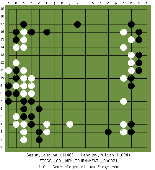 Last move : 1-0 2022 July 3 17:22:40 [Event "FICGS__GO__WCH_TOURNAMENT__000021 "] [Site "FICGS"] [Date "2022.03.14"] [Round "1"] [Black "Segur,Laurine "] [White "Kehayov,Yulian "] [Result "1-0"] [Rating 1 "1148"] [Rating 2 "1024"] 1.d4 q16 2.d16 q4 3.o3 c14 4.b15 b14 5.f16 f4 6.e3 f3 7.c7 d10 8.c9 d9 9.b11 c15 10.b16 c16 11.c17 b12 12.r3 q3 13.r4 q7 14.k17 j4 15.r17 c3 16.e2 c4 17.d5 c10 18.b10 c11 19.s15 r15 20.s16 q14 21.s13 r13 22.s11 r11 23.r9 q10 24.r10 r12 25.s12 c8 26.b8 d8 27.d7 b9 28.a9 c9 29.a7 b4 30.c5 b5 31.c6 c2 32.e6 a11 33.a8 1-0 Here are the names of the openings (joseki) played in the four corners : Corner q4 : q4 o3Hoshi (Hwajeom, Seongjeom, Xingwei`) 4-4 Point. The star or hoshi (4-4) point, emphasizing influence at the potential expense of territory.Ikken Kakari (Hankan Keolch'im, Yi Gua`jiao~, 1-Space Low Approach). Black 2 is the standard approach move to the 4-4. Corner d16 : d16 c14Hoshi (Hwajeom, Seongjeom, Xingwei`) 4-4 Point. The star or hoshi (4-4) point, emphasizing influence at the potential expense of territory.Ikken Kakari (Hankan Keolch'im, Yi Gua`jiao~, 1-Space Low Approach). White 2 is the standard approach move to the 4-4. Corner d4 : d4 f4Hoshi (Hwajeom, Seongjeom, Xingwei`) 4-4 Point. The star or hoshi (4-4) point, emphasizing influence at the potential expense of territory.Ikken Takagakari (Hankan Nop'dakeolch'im, Yi Gaojia, 1-Space High Approach). Black typically responds at 6-4 or 3-10. Black 4-10 is played when Black finds play on the right side advantageous. Black 4-8 or 3-8 may be played when Black has support at top. Corner q16 : q16 r17Hoshi (Hwajeom, Seongjeom, Xingwei`) 4-4 Point. The star or hoshi (4-4) point, emphasizing influence at the potential expense of territory. Player Black won this Go (weiqi, baduk) game.Follow this game move after move (download ) Against three in a row, play right in the center. (Anonymous) A good book on your shelf is a friend that turns its back on you and remains a friend. (Author unknown)