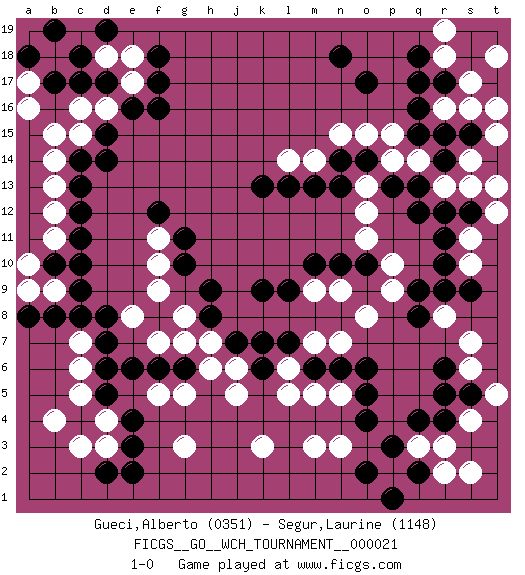 Last move : 1-0 2022 September 14 12:54:24 [Event "FICGS__GO__WCH_TOURNAMENT__000021"] [Site "FICGS"] [Date "2022.03.14"] [Round "1"] [Black "Gueci,Alberto"] [White "Segur,Laurine"] [Result "1-0"] [Rating 1 "0351"] [Rating 2 "1148"] 1.q16 d4 2.q4 d16 3.f17 e17 4.f16 g3 5.c14 c15 6.d14 c7 7.e16 e18 8.d15 b15 9.d17 c16 10.c18 d18 11.c17 c19 12.b17 b18 13.a18 a16 14.f18 a17 15.b19 b13 16.o17 r3 17.r4 q3 18.p3 s4 19.s5 p2 20.o4 r8 21.r11 s6 22.o2 t5 23.r5 s2 24.c11 b11 25.c12 b9 26.c10 k3 27.m13 e8 28.k13 s10 29.r10 s11 30.q13 s14 31.r6 s7 32.b10 a10 33.c9 m3 34.b8 a9 35.c8 s16 36.r17 s17 37.r15 r13 38.r12 r18 39.q18 r19 40.r14 s13 41.s15 t15 42.s12 t12 43.s9 t18 44.r9 t16 45.q8 t13 46.k9 g8 47.h9 m5 48.d7 c6 49.d6 c5 50.d8 f9 51.g6 h7 52.e4 d3 53.q2 r2 54.p1 n3 55.k7 j6 56.k6 j5 57.j7 h6 58.h8 g7 59.d5 b4 60.e3 m7 61.m6 l6 62.n6 n5 63.l7 l5 64.o5 f11 65.g10 f10 66.d2 c3 67.e2 f7 68.f6 g5 69.g11 n7 70.o6 o8 71.f12 p9 72.q9 o11 73.n10 o13 74.a8 b12 75.c13 b14 76.d19 r16 77.q15 p14 78.q17 q14 79.p13 o15 80.n14 n15 81.o14 p15 82.n18 m14 83.n13 o12 84.q12 n9 85.o10 p10 86.m10 m9 87.l9 f5 88.e6 l14 89.l13 1-0 Here are the names of the openings (joseki) played in the four corners : Corner d16 : d16 f17 Hoshi (Hwajeom, Seongjeom, Xingwei`) 4-4 Point. The star or hoshi (4-4) point, emphasizing influence at the potential expense of territory. Ikken Kakari (Hankan Keolch'im, Yi Gua`jiao~, 1-Space Low Approach). Black 2 is the standard approach move to the 4-4. Corner q4 : q4 r3 Hoshi (Hwajeom, Seongjeom, Xingwei`) 4-4 Point. The star or hoshi (4-4) point, emphasizing influence at the potential expense of territory. Player Black won this Go (weiqi, baduk) game. Follow this game move after move (download)Eyes win semiais. (Anonymous) Locking firmely the window serves nothing, only small thiefs pass through there, the big thiefs enter through the front door. (Luc-Olivier Leclerc)