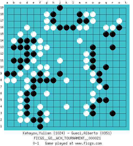 Last move : 0-1 2022 July 21 6:54:0 [Event "FICGS__GO__WCH_TOURNAMENT__000021"] [Site "FICGS"] [Date "2022.03.14"] [Round "1"] [Black "Kehayov,Yulian"] [White "Gueci,Alberto"] [Result "0-1"] [Rating 1 "1024"] [Rating 2 "0351"] 1.d4 d16 2.r3 r16 3.k16 o17 4.r13 c6 5.c13 c15 6.c11 c9 7.d11 f4 8.d6 d7 9.e6 c5 10.d5 c4 11.d3 c3 12.f3 g3 13.f2 g2 14.f1 g6 15.e7 d8 16.e8 e9 17.g8 g9 18.h8 k8 19.q10 n12 20.o13 k4 21.q5 n4 22.o3 n3 23.o4 o5 24.p5 o6 25.p8 p7 26.q7 o8 27.p9 o9 28.o10 n10 29.o11 n11 30.o12 g16 31.h17 h16 32.j16 g17 33.h18 g13 34.f9 f10 35.f8 g10 36.d13 b14 37.b13 e11 38.e12 e13 39.e14 f13 40.d14 f12 41.d12 d2 42.e2 c2 43.j9 j11 44.n17 n16 45.m17 m16 46.l16 m14 47.q15 q16 48.r15 g18 49.j19 e15 50.c10 d10 51.b9 b8 52.a9 a8 53.b11 f14 54.c14 n18 55.m18 o18 56.s16 s17 0-1 This go game has been lost on time (started : 2022.03.14 21:28:18) Here are the names of the openings (joseki) played in the four corners : Corner d4 : d4 c6 Hoshi (Hwajeom, Seongjeom, Xingwei`) 4-4 Point. The star or hoshi (4-4) point, emphasizing influence at the potential expense of territory. Ikken Kakari (Hankan Keolch'im, Yi Gua`jiao~, 1-Space Low Approach). White 2 is the standard approach move to the 4-4. Corner d16 : d16 c13 Hoshi (Hwajeom, Seongjeom, Xingwei`) 4-4 Point. The star or hoshi (4-4) point, emphasizing influence at the potential expense of territory. Niken Kakari (Dukan Keolch'im, E`r Gua`jiao~, 2-Space Low Approach). White typically answers by 7-3 or 3-5 (which is not joseki). Player White won this Go (weiqi, baduk) game. Follow this game move after move (download)In an unreasonable situation, an unreasonable move is reasonable. (Tamino) Think like a man of action, act like a man of thought. (Henri Louis Bergson)