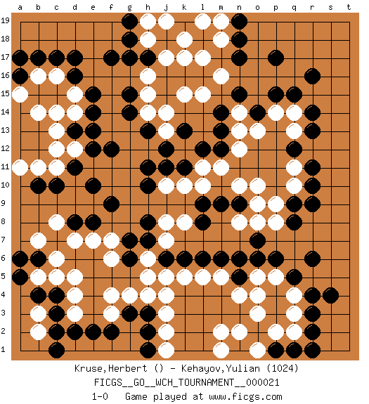 Last move : 1-0 2022 July 24 0:37:0 [Event "FICGS__GO__WCH_TOURNAMENT__000021"] [Site "FICGS"] [Date "2022.03.14"] [Round "1"] [Black "Kruse,Herbert"] [White "Kehayov,Yulian"] [Result "1-0"] [Rating 2 "1024"] 1.r16 d4 2.d16 q4 3.r6 c14 4.f17 k17 5.e14 d12 6.r9 j4 7.c10 c8 8.e10 l5 9.f12 c16 10.c17 b16 11.p17 l17 12.c3 b2 13.c4 d5 14.b6 c6 15.c2 b3 16.e2 d3 17.d2 b5 18.c1 f4 19.g3 g4 20.b4 c5 21.a5 b7 22.o6 o4 23.b17 q10 24.r10 q11 25.r13 q13 26.s4 q3 27.f9 f7 28.h3 j3 29.a6 f3 30.f2 j2 31.r2 q2 32.r11 o10 33.q5 p5 34.r14 q14 35.g14 k10 36.d13 c13 37.p6 o5 38.n17 d14 39.e13 d15 40.e15 b11 41.h17 k15 42.a16 a15 43.a17 b14 44.k13 j13 45.j12 j14 46.k11 j10 47.j11 l11 48.m13 l15 49.n15 n13 50.j18 k18 51.m14 j17 52.m12 m11 53.n6 n12 54.q9 p9 55.n5 n4 56.d17 h18 57.g18 h19 58.l6 m5 59.k6 h16 60.b10 a11 61.m6 k5 62.q1 p2 63.p1 o1 64.r1 h4 65.o2 n2 66.n1 m2 67.g17 h15 68.h1 j1 69.h2 m1 70.g19 j19 71.r4 o1 72.r3 o3 73.j6 j5 74.h11 m18 75.h10 j8 76.h8 j7 77.h7 h6 78.g6 h5 79.g7 f6 80.l8 k8 81.l9 l10 82.n18 l19 83.d11 c11 84.e12 c12 85.e8 e7 86.q15 p14 87.n19 m19 88.m9 n10 89.l12 p8 90.h13 h14 91.d8 d7 92.q8 n8 93.n9 o9 94.o7 o8 95.g15 m16 96.o14 o13 97.p15 n14 98.q12 1-0 This go game has been lost on time (started : 2022.03.14 21:28:18) Here are the names of the openings (joseki) played in the four corners : Corner q4 : q4 r6 Hoshi (Hwajeom, Seongjeom, Xingwei`) 4-4 Point. The star or hoshi (4-4) point, emphasizing influence at the potential expense of territory. Ikken Kakari (Hankan Keolch'im, Yi Gua`jiao~, 1-Space Low Approach). Black 2 is the standard approach move to the 4-4. Corner d16 : d16 c14 Hoshi (Hwajeom, Seongjeom, Xingwei`) 4-4 Point. The star or hoshi (4-4) point, emphasizing influence at the potential expense of territory. Ikken Kakari (Hankan Keolch'im, Yi Gua`jiao~, 1-Space Low Approach). White 2 is the standard approach move to the 4-4. Player Black won this Go (weiqi, baduk) game. Follow this game move after move (download)Grab the border points between two moyos. (Anonymous) You can't play chess if you're groggy from pills. (Anatoly Karpov)