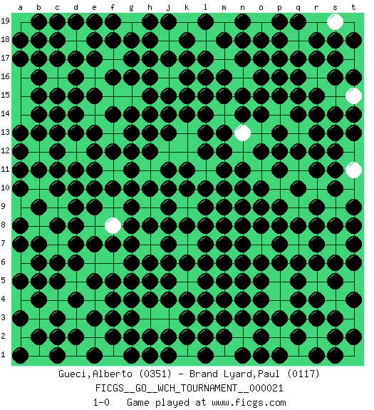 Last move : 1-0 2022 October 14 19:35:6 [Event "FICGS__GO__WCH_TOURNAMENT__000021"] [Site "FICGS"] [Date "2022.03.14"] [Round "1"] [Black "Gueci,Alberto"] [White "Brand Lyard,Paul"] [Result "1-0"] [Rating 1 "0351"] [Rating 2 "0117"] 1.q16 r16 2.r17 r18 3.r15 s15 4.s16 a2 5.d4 t15 6.d16 a19 7.q4 t1 8.q10 p10 9.p11 q13 10.p9 o8 11.o10 n10 12.k16 j16 13.j15 j14 14.j17 h16 15.k15 l15 16.r14 s13 17.k14 k13 18.l14 m13 19.l13 k7 20.n9 n8 21.m9 l9 22.m10 l4 23.h15 g15 24.g16 g17 25.f16 f15 26.e15 e16 27.e17 f18 28.f14 f13 29.g13 g14 30.h14 s2 31.r3 s4 32.s3 r4 33.q5 p4 34.p3 o13 35.r13 n13 36.m8 m7 37.l8 k9 38.l7 t3 39.r6 f9 40.o17 r2 41.f4 e4 42.q3 q2 43.o3 o4 44.e5 d5 45.e3 e2 46.m3 r10 47.q8 d12 48.d9 f8 49.k6 p15 50.r12 m17 51.j6 s7 52.r7 q7 53.e10 p6 54.d7 c7 55.c8 b8 56.c6 h6 57.h5 n14 58.o16 h3 59.f2 g2 60.d2 b15 61.c14 j11 62.j4 j3 63.l3 h11 64.f10 n16 65.o15 h9 66.g10 f11 67.b14 o5 68.r9 s9 69.s8 l11 70.j7 n2 71.n3 n4 72.c11 o12 73.k18 l18 74.n18 k3 75.k4 n6 76.m5 n5 77.m4 l5 78.l6 k5 79.j5 g7 80.m6 h7 81.j8 g6 82.e7 s11 83.t8 o1 84.l2 m11 85.e18 d18 86.c18 j12 87.l12 b10 88.c10 q18 89.q17 b3 90.c2 j1 91.p18 b12 92.c12 b6 93.b7 h19 94.n11 e14 95.b5 b1 96.k2 m1 97.o2 a17 98.g5 t18 99.s17 b16 100.c13 p14 101.q15 c4 102.c3 a4 103.c17 f1 104.f3 t6 105.s6 k10 106.n15 t13 107.b2 e6 108.j9 d1 109.g12 p19 110.b4 a5 111.c5 o7 112.n7 f6 113.s14 h1 114.m7 a11 115.l17 s19 116.m18 k19 117.k17 r1 118.s18 q11 119.p1 n19 120.r11 k1 121.j2 e8 122.a3 d19 123.c19 b17 124.q14 t17 125.o18 t11 126.p8 b19 127.b18 p16 128.s12 a6 129.b11 a9 130.m2 t16 131.s10 m19 132.e1 g19 133.m16 e19 134.g1 a14 135.d17 t12 136.q12 s5 137.a7 a6 138.h10 g9 139.n1 a4 140.h17 j18 141.a18 a19 142.d6 o19 143.h18 f17 144.p17 t10 145.h2 g15 146.l1 a15 147.l19 d11 148.d10 c9 149.b9 d14 150.d8 a13 151.c1 j1 152.d15 q1 153.h12 f12 154.l10 r19 155.h8 g3 156.a5 t9 157.a10 t4 158.r8 p2 159.h13 n12 160.c15 c16 161.a12 f19 162.o1 p5 163.q19 o19 164.j19 q6 165.g18 f19 166.a8 g19 167.f5 j16 168.e19 m19 169.o9 e13 170.n17 p13 171.e11 h19 172.f18 s1 173.t2 t14 174.p12 a16 175.l16 m15 176.g11 r5 177.a11 g19 178.p19 k12 179.h4 k5 180.p7 k1 181.l4 f15 182.pass f19 183.pass t5 184.o14 m14 185.pass p2 186.q2 f17 187.g17 j13 188.d13 r2 189.g8 q1 190.r1 s2 191.s1 r2 192.s2 e9 193.pass d18 194.d19 k11 195.pass o11 196.n10 r10 197.b19 g14 198.b6 t19 199.pass pass 200.pass pass 201.f7 f9 202.o6 o4 203.s10 t12 204.t7 g6 205.g4 t15 206.l5 s5 207.j10 s19 208.k8 s4 209.m12 o13 210.f14 n14 211.e12 n13 212.b13 g3 213.h19 g19 214.f19 p6 215.h1 e8 216.n19 a15 217.h16 a16 218.a1 n12 219.pass a14 220.pass k1 221.j1 k11 222.pass t17 223.pass pass 224.pass pass 225.pass pass 226.pass pass 227.pass pass 228.pass pass 229.pass n5 230.pass j13 231.pass e14 232.pass pass 233.pass pass 234.pass f13 235.pass e6 236.pass p5 237.pass t5 238.pass t9 239.pass r5 240.pass h7 241.pass o7 242.pass m13 243.pass k9 244.pass j3 245.pass pass 246.pass p4 247.pass a17 248.pass d12 249.pass pass 250.pass h9 251.g9 h11 252.j11 m15 253.pass pass 254.pass k12 255.pass c16 256.b16 o5 257.n6 p15 258.pass r4 259.q6 p14 260.n4 g15 261.pass p4 262.p13 o8 263.n8 o4 264.p16 o5 265.t6 l11 266.t4 p5 267.pass m14 268.o12 s4 269.l15 r5 270.s5 n13 271.r4 t11 272.p6 a13 273.n5 f8 274.e9 q18 275.r18 f8 276.pass m14 277.pass p5 278.pass t10 279.pass p4 280.pass t13 281.t14 o7 282.o8 f6 283.g7 h3 284.k3 t19 285.g2 h3 286.h6 f6 287.b15 o4 288.b17 n14 289.o5 p4 290.e13 f11 291.f12 s9 292.d11 a14 293.s11 p14 294.p15 m15 295.s13 r19 296.t18 t10 297.pass p5 298.o4 k13 299.k10 j3 300.g3 a16 301.pass s19 302.d14 j12 303.l9 a15 304.m11 t12 305.j14 k13 306.a13 n12 307.a17 f15 308.g14 o13 309.m13 k12 310.t16 j12 311.k11 n13 312.j13 m14 313.n14 s9 314.t9 t11 315.t13 t11 316.m15 e6 317.g6 1-0 Here are the names of the openings (joseki) played in the four corners : Corner q16 : q16 r16 Hoshi (Hwajeom, Seongjeom, Xingwei`) 4-4 Point. The star or hoshi (4-4) point, emphasizing influence at the potential expense of territory. Corner d4 : a2 d4 This joseki is unknown. A weak or weird move has probably been played in this corner. Corner d16 : d16 a19 Hoshi (Hwajeom, Seongjeom, Xingwei`) 4-4 Point. The star or hoshi (4-4) point, emphasizing influence at the potential expense of territory. Corner q4 : q4 t1 Hoshi (Hwajeom, Seongjeom, Xingwei`) 4-4 Point. The star or hoshi (4-4) point, emphasizing influence at the potential expense of territory. Player Black won this Go (weiqi, baduk) game. Follow this game move after move (download)Extend one hand from the cutting points. (Anonymous) The Internet is so big, so powerful and pointless that for some people it is a complete substitute for life. (Andrew Brown)