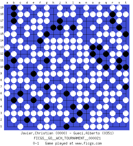 Last move : 0-1 2023 January 13 8:48:33 [Event "FICGS__GO__WCH_TOURNAMENT__000021"] [Site "FICGS"] [Date "2022.03.14"] [Round "1"] [Black "Javier,Christian"] [White "Gueci,Alberto"] [Result "0-1"] [Rating 1 "0000"] [Rating 2 "0351"] 1.d6 q4 2.r16 d4 3.n14 d16 4.p5 p4 5.q3 p3 6.o4 q5 7.q6 r6 8.r4 r5 9.s5 s6 10.r7 p6 11.p7 q7 12.q8 q6 13.o6 o5 14.o8 n6 15.n7 o7 16.p9 p8 17.r9 f3 18.f5 p17 19.n9 m17 20.s3 r2 21.n3 j3 22.h4 h3 23.j2 k3 24.k4 j4 25.l5 m7 26.m8 q16 27.m6 n8 28.o10 o9 29.l7 m9 30.n10 l8 31.l9 k9 32.l10 k8 33.k7 j5 34.k6 h7 35.j8 j7 36.s7 r15 37.r17 d8 38.j10 j9 39.h8 g8 40.h9 h10 41.k11 h11 42.g10 g9 43.h12 q15 44.q10 c5 45.j6 g12 46.t6 c14 47.l3 k2 48.h5 h6 49.g6 g14 50.h2 g2 51.f11 c10 52.l2 m4 53.e5 k15 54.k5 e17 55.k1 h13 56.j12 g3 57.g4 f4 58.s8 s15 59.p11 k13 60.m10 m8 61.g1 c3 62.f2 m5 63.e4 e3 64.d2 e2 65.e1 d3 66.d5 e7 67.m3 m15 68.c6 b7 69.b5 b4 70.p2 r3 71.t4 q2 72.c2 b2 73.l4 l6 74.n4 m13 75.l1 p14 76.j1 n13 77.b1 g5 78.a4 b3 79.n2 o2 80.o1 p1 81.m1 r12 82.d14 d13 83.g11 j13 84.f13 g13 85.o8 d15 86.e14 c13 87.p7 p12 88.c4 k10 89.a5 a3 90.a1 j11 91.k12 l11 92.l12 l13 93.b8 b9 94.c7 c8 95.o12 m12 96.o13 o14 97.q12 r11 98.p13 q13 99.d1 f1 100.r13 r14 101.m6 n5 102.q14 s13 103.f2 q13 104.g7 p8 105.f14 f12 106.e12 e11 107.a7 a8 108.b6 p18 109.d12 d11 110.e8 f8 111.e9 o9 112.h4 s2 113.o15 b8 114.g4 h5 115.d10 c11 116.c12 e13 117.h12 s4 118.t7 n11 119.s10 t3 120.b13 b14 121.a14 a15 122.c15 b16 123.c16 c17 124.b11 b12 125.a12 b15 126.c12 t5 127.a10 o8 128.n16 n12 129.s11 s12 130.r1 m11 131.d12 o11 132.g15 p10 133.s16 q9 134.f15 p9 135.l16 m16 136.n17 n18 137.m18 l18 138.m19 l19 139.o19 n19 140.q17 q18 141.r18 l6 142.n15 m14 143.j12 k12 144.j12 h12 145.o17 o18 146.q19 f1 147.a2 c1 148.r19 p19 149.t16 r8 150.h8 r10 151.t15 t9 152.t14 s14 153.t12 t13 154.s1 p2 155.h15 h1 156.h16 s9 157.l17 g17 158.k17 s18 159.j16 k14 160.j17 s17 161.t17 t18 162.d2 d7 163.e15 f17 164.h18 g18 165.h19 g19 166.m10 n10 167.f19 a6 168.e18 d18 169.d19 c18 170.h17 a7 171.g16 c5 172.b18 c19 173.b19 k18 174.l15 a13 175.j15 j18 176.e10 f10 177.g11 e19 178.b17 f18 179.f7 f6 180.l9 l10 181.g7 e6 182.d9 c9 183.c6 b12 184.e5 s19 185.p16 e16 186.b5 g1 187.s16 m6 188.g4 n1 189.t1 o1 190.t15 p15 191.r17 o3 192.t10 m2 193.r18 r19 194.j8 f9 195.l4 e12 196.k6 j14 197.m3 k16 198.e9 l14 199.n4 h14 200.l2 f16 201.k1 j19 202.j17 o16 203.j16 q1 204.h16 t2 205.g15 t8 206.t7 s7 207.f14 f15 208.l16 h9 0-1 Here are the names of the openings (joseki) played in the four corners : Corner d4 : d6 d4 Ootakamoku (Chaogao) 6-4 Point. The large takamoku (high) point (6-4), experimented with during the "new fuseki" movement in Japan in the 1930's. This point is seldom played as the initial corner point nowadays. Corner q4 : q4 p5 Hoshi (Hwajeom, Seongjeom, Xingwei`) 4-4 Point. The star or hoshi (4-4) point, emphasizing influence at the potential expense of territory. Player White won this Go (weiqi, baduk) game. Follow this game move after move (download)The nature of a game comes from what is played, but it's the sensitivity to the possible and the impossible that gives it value. (Pierre Audouard) No man has ever achieved immortality in his own life time. (Unknown)