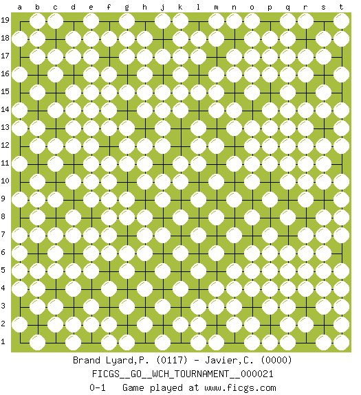 Last move : 0-1 2022 July 16 11:58:26 [Event "FICGS__GO__WCH_TOURNAMENT__000021"] [Site "FICGS"] [Date "2022.03.14"] [Round "1"] [Black "Brand Lyard,Paul"] [White "Javier,Christian"] [Result "0-1"] [Rating 1 "0117"] [Rating 2 "0000"] 1.r17 b3 2.a3 b4 3.b5 c5 4.b6 c7 5.c8 d8 6.d9 b8 7.b9 a7 8.a8 a5 9.a6 c6 10.d6 c9 11.c10 b7 12.b2 a9 13.a10 b10 14.b11 b9 15.c11 a11 16.d11 c12 17.c13 b13 18.r16 e10 19.f10 e9 20.c4 d4 21.e4 c3 22.t1 e11 23.p10 d12 24.e12 b12 25.a12 a13 26.f12 d10 27.d3 e5 28.f5 e3 29.l16 f4 30.g4 g3 31.f3 f2 32.d5 d2 33.b11 c11 34.b6 e7 35.e6 f6 36.g6 f7 37.g7 d7 38.e8 f8 39.g8 g9 40.p14 o8 41.g2 h2 42.j2 g1 43.d13 d14 44.s12 g5 45.f13 e14 46.f14 e13 47.o14 c14 48.n8 h4 49.j4 j3 50.k3 k4 51.l4 j5 52.q19 h6 53.j6 k6 54.l6 k2 55.k13 l3 56.e17 j7 57.o2 j1 58.m13 h7 59.l10 h8 60.g14 e15 61.j8 k8 62.l8 l7 63.j18 f15 64.g16 j9 65.m11 l5 66.m5 m4 67.h11 m6 68.n6 n5 69.t7 m8 70.q5 n7 71.b18 l9 72.m16 n9 73.o17 o6 74.o7 p7 75.j15 g12 76.r10 g15 77.n10 k10 78.n4 o4 79.j10 h10 80.j11 l11 81.b16 n3 82.o3 m10 83.p15 n11 84.o12 m12 85.n12 o10 86.r2 g13 87.e19 h14 88.f11 g11 89.g10 f9 90.o9 p9 91.q9 p11 92.f17 q10 93.q11 r9 94.b14 q8 95.c15 r11 96.k12 s10 97.l19 q12 98.s14 h12 99.q13 j12 100.q7 r7 101.n2 q6 102.r5 k14 103.d18 k11 104.n18 l13 105.s4 j13 106.n19 l12 107.t3 n13 108.g19 m14 109.t19 a14 110.c1 b15 111.a19 c16 112.m1 d15 113.c19 b17 114.l17 a16 115.j16 o13 116.o16 p12 117.p1 o11 118.j19 p5 119.t14 c2 120.t17 s8 121.s1 d1 122.h18 l15 123.s19 h16 124.q3 b1 125.t11 a2 126.f19 g17 127.q4 f16 128.k15 a4 129.q17 j17 130.m2 j14 131.p19 h15 132.s3 k16 133.d6 p4 134.s16 k17 135.r18 e16 136.t5 h17 137.r15 d17 138.p18 f18 139.k15 j15 140.q16 e18 141.d19 r13 142.n15 l2 143.p3 q14 144.q15 p13 145.m19 t9 146.n17 m3 147.q2 n14 148.e6 d5 149.f12 g18 150.g14 f14 151.h19 k18 152.j11 r6 153.s6 s7 154.o1 t8 155.p16 k19 156.n16 m15 157.c18 a18 158.t18 c17 159.m18 l18 160.n1 b19 161.f19 e19 162.t16 g19 163.r4 l1 164.p17 j10 165.s18 h11 166.t13 p6 167.r14 r12 168.h19 h18 169.t15 n4 170.t2 j19 171.t6 s11 172.s13 t10 173.s15 k15 174.o19 r10 175.o18 e12 176.r3 f13 177.s17 q13 178.o15 f11 179.s5 q11 180.p2 b5 181.s2 a6 182.r1 o5 183.t4 q1 184.r19 o12 185.q18 q5 186.r3 q3 187.t2 q4 188.n1 r2 189.e1 s3 190.p2 r4 191.o3 p3 192.s5 o2 193.m2 n2 194.m17 t12 195.q17 m1 196.t19 o1 197.c18 d18 198.n18 n17 199.r16 s4 200.p18 c19 201.r18 b18 202.s16 t14 203.p19 o17 204.t1 m18 205.p15 n19 206.n15 o18 207.s17 o15 208.l16 m16 209.s15 n16 210.r19 l17 211.p16 p14 212.t17 q15 213.s18 o16 214.t5 p17 215.r15 r14 216.t15 q16 217.t4 s14 218.q18 r5 219.s19 o19 220.t6 p16 221.s6 t3 222.s2 s1 223.q19 t7 224.r17 p1 225.s13 s12 226.t16 t18 227.r18 t13 228.s19 q2 229.s16 r16 230.t5 t16 231.q19 s17 232.s6 s15 233.t6 t4 234.t19 s5 235.r19 e2 236.q18 f1 237.t2 r17 238.p19 p18 239.t6 q17 240.s6 t5 241.s2 s18 242.q19 t1 243.s19 r19 244.r18 q18 245.l19 m19 246.p19 r19 247.p19 q19 248.s2 t19 249.d6 e6 250.f17 e17 251.pass t2 252.t6 s6 253.g7 g8 254.g10 f10 255.pass g6 256.c13 d13 0-1 Here are the names of the openings (joseki) played in the four corners : Corner d4 : b3 a3 This joseki is unknown. A weak or weird move has probably been played in this corner. Corner q4 : t1 o8 This joseki is unknown. A weak or weird move has probably been played in this corner. Player White won this Go (weiqi, baduk) game. Follow this game move after move (download)In the opening, when you don't know what to play, make a shimari. (Jansteen) Do you know these so called Volunteers don't even get paid! (Simpsons)
