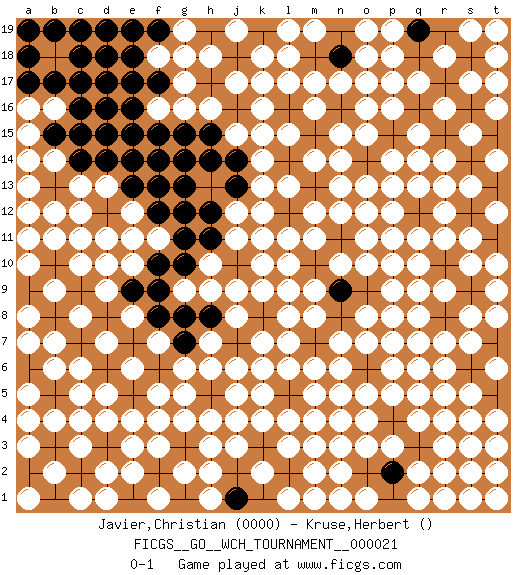 Last move : 0-1 2022 June 1 17:21:54 [Event "FICGS__GO__WCH_TOURNAMENT__000021"] [Site "FICGS"] [Date "2022.03.14"] [Round "1"] [Black "Javier,Christian"] [White "Kruse,Herbert"] [Result "0-1"] [Rating 1 "0000"] 1.r17 q4 2.q16 c4 3.e16 e3 4.g15 o17 5.n16 m17 6.n18 o16 7.p15 o15 8.o14 n15 9.m15 m16 10.l16 n17 11.l18 l15 12.l14 m14 13.m13 k14 14.l13 k13 15.k12 j12 16.j13 k11 17.l12 h13 18.j14 j15 19.k15 k16 20.m15 n14 21.n13 l17 22.k17 l15 23.j16 k14 24.h15 k15 25.h14 j17 26.h17 k18 27.j18 h16 28.k19 k17 29.g18 g17 30.f17 h18 31.f19 j19 32.h19 g19 33.e18 f18 34.e19 g14 35.g13 f16 36.e17 o13 37.p14 k13 38.h12 j11 39.f15 g16 40.f14 l19 41.m18 o18 42.o19 m19 43.n19 p19 44.r19 l11 45.m11 n12 46.n11 m12 47.o11 p11 48.p12 p10 49.o9 o10 50.n9 n10 51.m10 p9 52.q11 r11 53.q9 q10 54.q12 r9 55.q8 p8 56.p7 q7 57.r8 o7 58.p6 r7 59.s8 o8 60.n8 n7 61.m7 m8 62.m9 l8 63.n6 m6 64.o6 l7 65.k8 k9 66.j9 j8 67.k7 h9 68.j10 h10 69.k10 l10 70.s9 s10 71.s12 o12 72.s6 q6 73.q5 r5 74.p5 r6 75.r4 s4 76.r3 s7 77.t5 s5 78.t7 t6 79.s3 t8 80.t9 t10 81.t11 r12 82.q13 s13 83.t13 s11 84.p3 k6 85.j7 h7 86.g8 j6 87.l5 m5 88.s14 t12 89.t15 t14 90.s16 l9 91.q8 r14 92.r15 s15 93.t17 t16 94.s18 q14 95.g11 p13 96.g10 g9 97.f9 q15 98.p16 r16 99.q17 s17 100.p18 t18 101.q18 t19 102.g7 g6 103.f6 f5 104.g5 h6 105.h5 l4 106.k5 j5 107.j4 k4 108.k3 l6 109.e5 f4 110.h3 g4 111.g3 h4 112.j2 j3 113.l2 j4 114.e7 d5 115.d6 e4 116.h11 e6 117.f8 f7 118.d8 c6 119.c7 d7 120.e9 e8 121.c9 b7 122.b8 c8 123.d10 d9 124.f10 b9 125.b10 c10 126.e11 d11 127.d12 e10 128.f12 d10 129.e13 c12 130.b11 b12 131.b13 a11 132.q19 o19 133.q3 l3 134.n4 c13 135.p4 b14 136.e15 a13 137.d14 k2 138.b5 h2 139.j1 g2 140.j10 m2 141.t4 t3 142.t2 s2 143.s1 t1 144.r1 r2 145.q2 q1 146.p1 l1 147.s19 t17 148.h8 j9 149.g1 f3 150.r1 n5 151.o4 n3 152.c15 d13 153.c14 e12 154.d16 f11 155.b3 b4 156.n2 n1 157.o2 p17 158.d3 d2 159.c2 c3 160.a2 c1 161.b1 b2 162.a4 a3 163.b15 a5 164.c16 a15 165.l12 b16 166.b17 a16 167.r8 m3 168.a17 a14 169.c17 o3 170.l13 m1 171.o1 t2 172.p2 t4 173.s9 s1 174.s8 q1 175.a10 a12 176.a6 a4 177.e1 r1 178.t9 q9 179.l5 r18 180.f2 e2 181.g3 f1 182.k1 h1 183.d17 r13 184.a9 a8 185.r8 c11 186.q19 o5 187.j7 m4 188.b10 q4 189.q3 k10 190.m10 k7 191.a9 g18 192.q18 a1 193.p4 e11 194.p2 a10 195.p6 k5 196.q16 b11 197.o2 h3 198.o6 d4 199.q12 d1 200.p15 b6 201.s9 c5 202.n9 a7 203.p5 p3 204.r3 r4 205.q2 s8 206.p12 q8 207.h5 g5 208.j1 t9 209.o1 q17 210.n11 p16 211.r19 p18 212.s18 s19 213.m13 p14 214.m18 m11 215.o4 o11 216.p1 m9 217.q19 n2 218.g14 s3 219.p2 q11 220.p1 q13 221.n18 q5 222.q3 n4 223.g12 n6 224.o2 p7 225.d18 o1 226.l14 n13 227.c18 k12 228.p4 q2 229.d15 r3 230.n19 l18 231.l14 l13 232.p5 pass 233.p2 pass 234.n18 p6 235.f13 o4 236.p4 p5 237.e14 pass 238.q12 p12 239.c19 pass 240.a18 pass 241.b19 pass 242.a19 pass 243.pass pass 244.d19 pass 245.pass pass 246.pass pass 247.pass pass 248.pass pass 249.pass pass 250.pass pass 251.pass pass 252.pass pass 253.pass pass 254.pass pass 255.pass 0-1 Here are the names of the openings (joseki) played in the four corners : Corner q4 : q4 o9 Hoshi (Hwajeom, Seongjeom, Xingwei`) 4-4 Point. The star or hoshi (4-4) point, emphasizing influence at the potential expense of territory. Player White won this Go (weiqi, baduk) game. Follow this game move after move (download)Fighting must not be the key to go, it should be reserved as your last resource. (Zhong-Pu Liu, about Weiqi) I live to kill Traxler counterattack. (Ilmars Cirulis)
