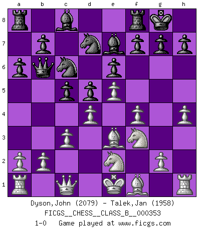 Last move : 1-0 2022 July 10 1:23:8 [Event "FICGS__CHESS__CLASS_B__000353"] [Site "FICGS"] [Date "2022.03.15"] [Round "1"] [White "Dyson,John"] [Black "Talek,Jan"] [Result "1-0"] [WhiteElo "2079"] [BlackElo "1958"] 1.e4 e6 2.d4 d5 3.Nc3 Nf6 4.e5 Nfd7 5.f4 c5 6.Nf3 Nc6 7.Be3 a6 8.Ne2 Qb6 9.Qc1 Be7 10.c3 O-O 11.h4 1-0 French : Steinitz, Boleslavsky variation Kingside Castling by player Black (move 10) Player White won this chess game. Follow this game move after move (download)It was clear to me that the vulnerable point of the American Grandmaster (Bobby Fischer) was in double-edged, hanging, irrational positions, where he often failed to find a win even in a won position. (Efim Geller) Fischer ist das größte Genie, das je vom Schachhimmel heruntergestiegen ist. (Mikhail Nekhemyevich Tal) El Ajedrez expande y enriquece tu mente. (Saudin Robovic) Les écrivains ont utilisé les échecs pour analyser les côtés extrêmes de la nature humaine. Dans ce cadre, les échecs offrent un champ d'expérimentation idéal. Mais on pourrait faire la même chose avec la peinture. Et là, en vous référant à Van Gogh, vous ne tirerez pas de conclusion définitive sur les peintres. (Gary Kasparov) Life is painting a picture, not doing a sum. (Oliver Wendell Holmes, Jr.)