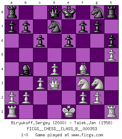 Last move : 1-0 2022 June 5 16:6:33 [Event "FICGS__CHESS__CLASS_B__000353"] [Site "FICGS"] [Date "2022.03.15"] [Round "1"] [White "Biryukoff,Sergey"] [Black "Talek,Jan"] [Result "1-0"] [WhiteElo "2000"] [BlackElo "1958"] 1.e4 c6 2.d4 d5 3.Nd2 dxe4 4.Nxe4 Bf5 5.Ng3 Bg6 6.h4 h6 7.Nf3 Nd7 8.h5 Bh7 9.Bd3 Bxd3 10.Qxd3 e6 11.Bf4 Bb4+ 12.c3 1-0 Caro-Kann : 3.Nd2 Player White won this chess game. Follow this game move after move (download)During a Chess competition a Chessmaster should be a combination of a beast of prey and a monk. (Alexander Alekhine) Auf jeden Fall musst du zuerst Rechtsanwalt werden, damit du deine eigenen Interessen und die deiner Familie vertreten kannst. [Brief an seinen Sohn] (José Raúl Capablanca) Creo que una cierta cantidad de temperamento es esperada de los genios del Ajedrez. (Ron Gross) Seul un grand joueur sait à quel point il joue faiblement. (Xavier Tartacover) Never risk one's whole fortune unless supported by one's entire army. (Niccolo Machiavelli)