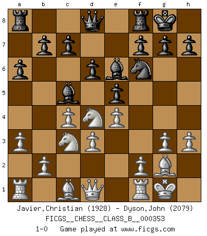 Last move : 1-0 2022 July 11 16:29:33 [Event "FICGS__CHESS__CLASS_B__000353"] [Site "FICGS"] [Date "2022.03.15"] [Round "1"] [White "Javier,Christian"] [Black "Dyson,John"] [Result "1-0"] [WhiteElo "1928"] [BlackElo "2079"] 1.c4 e5 2.Nc3 Nf6 3.g3 Bb4 4.Bg2 O-O 5.e4 d6 6.Nge2 Nc6 7.d3 a6 8.O-O Bc5 9.a3 Nd4 10.h3 Be6 11.Nxd4 1-0 This chess game has been lost on time (started : 2022.03.15 10:11:20) English : Bremen, Smyslov system Kingside Castling by player Black (move 4) Kingside Castling by player White (move 8) Player White won this chess game. Follow this game move after move (download)The only thing Chess players have in common is Chess. (Lodewijk Prins) Garry Kasparov war erst in der Großmeister-Organisation GMA, dann in der Profischach-Vereinigung PCA, zum Schluss kehrte er wieder in den Schoß der FIDE zurück. Aber gut, manche Leute sind flexibel (Viswanathan Anand) Por la belleza de sus partidas, la claridad de su juego y lo brillante de sus ideas, Fischer se creó el mismo como un artista de la misma estatura como Brahms, Rembrandt y Shakespeare. (David Levy) Ce n'est pas pour s'amuser qu'il joue aux échecs : il célèbre un culte. (Vladimir Nabokov) Games, world of games... There's always an opponent, and there's always a victim. (Revolver, movie)