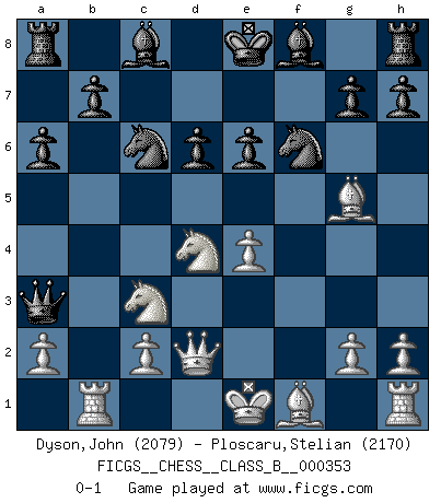 Last move : 0-1 2022 August 9 20:53:58 [Event "FICGS__CHESS__CLASS_B__000353"] [Site "FICGS"] [Date "2022.03.15"] [Round "1"] [White "Dyson,John"] [Black "Ploscaru,Stelian"] [Result "0-1"] [WhiteElo "2079"] [BlackElo "2170"] 1.e4 c5 2.Nc3 d6 3.Nge2 Nf6 4.d4 cxd4 5.Nxd4 a6 6.Bg5 e6 7.f4 Qb6 8.Qd2 Qxb2 9.Rb1 Qa3 10.f5 Nc6 11.fxe6 fxe6 0-1 This chess game has been lost on time (started : 2022.03.15 10:11:20) Sicilian : Closed Player Black won this chess game. Follow this game move after move (download)I have added these principles to the law: get the Knights into action before both Bishops are developed. (Emanuel Lasker) Offener Brief an US-Präsident Bush anlässlich der Verhaftung Bobby Fishers: Verhaften Sie mich. Stecken Sie mich in dieselbe Zelle wie Bobby Fisher und geben Sie uns ein Schachspiel mit. (Boris Vassilievich Spassky) Yo adoro todas la posiciones. Denme una partida posicional difícil, y la jugaré. Pero posiciones totalmente ganadas, no las tolero. (Hein Donner) Comme les marins qui ont mille raisons différentes d'aller en mer, les joueurs d'échecs en ont tout autant avant de s'installer devant une table et jouer... (Vincent Bertignac, philosophe) Art is the triumph over chaos. (John Cheever)