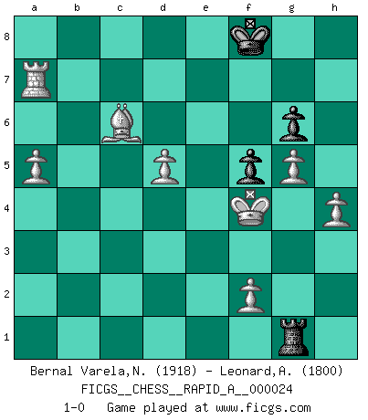 Last move : 1-0 2008 April 1 23:44:56 [Event "FICGS__CHESS__RAPID_A__000024"] [Site "FICGS"] [Date "2007.07.31"] [Round "1"] [White "Bernal Varela,Nelson"] [Black "Leonard,Andrew"] [Result "1-0"] [WhiteElo "1918"] [BlackElo "1800"] 1.e4 g6 2.d4 Bg7 3.Nc3 d6 4.Nf3 Nf6 5.Be2 O-O 6.O-O c6 7.Bg5 d5 8.Bd3 dxe4 9.Nxe4 Nxe4 10.Bxe4 Nd7 11.c3 Qb6 12.Qe2 Nf6 13.Bd3 Bg4 14.Bc4 Nd5 15.h3 Bf5 16.Rfe1 Rfe8 17.Qd2 Qc7 18.Bh4 b5 19.Bg3 Qb7 20.Bb3 Rad8 21.Be5 Bxe5 22.Nxe5 f6 23.Ng4 Kg7 24.Qh6+ Kg8 25.Re2 Bxg4 26.hxg4 e6 27.Rae1 Qd7 28.g5 f5 29.Qh2 Re7 30.Qg3 Qd6 31.Re5 Rde8 32.a3 a6 33.Qf3 Kg7 34.Qh3 Qc7 35.Qh4 Qd6 36.Qh2 Kg8 37.Qh3 Kg7 38.Ba2 a5 39.Bb3 a4 40.Ba2 Kf8 41.Qg3 Qc7 42.Kh2 Qb8 43.Qd3 Qd6 44.Rh1 Kg7 45.Kg1 Kf8 46.Rh4 Kg8 47.c4 bxc4 48.Qxc4 Rb8 49.Qc1 Reb7 50.Re2 Rc7 51.Rc2 R8b7 52.Rc4 Ra7 53.Bb1 Ra6 54.Bc2 Nb6 55.Rc5 Nd5 56.Bd1 Rc8 57.Rc4 Nb6 58.Rc3 Nd5 59.Rc2 Rb6 60.Re2 Ra8 61.Qc5 Qd7 62.Kh1 Rab8 63.Qc1 Ra8 64.Rc2 Qd6 65.Be2 Ra7 66.Kg1 Rab7 67.Bd3 Rf7 68.Re2 R6b7 69.Bc2 Ra7 70.Bd1 Ra5 71.Re5 Rb7 72.Be2 Ra8 73.Bc4 Rf8 74.Qe1 Re8 75.Re2 Kg7 76.g3 Kg8 77.Qc1 Kg7 78.Qd2 Kg8 79.Re5 Qb8 80.Qe1 Rxb2 81.Rxe6 Rf8 82.Rxc6 Rb1 83.Bxd5+ Kg7 84.Rc1 Re8 85.Qf1 Rxc1 86.Qxc1 Qb6 87.Kg2 h5 88.Qc6 Qxc6 89.Bxc6 Re2 90.d5 Rd2 91.Rxa4 Kf8 92.Ra7 Rd1 93.a4 h4 94.gxh4 Rd4 95.a5 Rg4+ 96.Kf3 Rg1 97.Kf4 1-0 Robatsch defense : Two knights variation Kingside Castling by player Black (move 5) Kingside Castling by player White (move 6) Player White won this chess game. Follow this game move after move (download)Bobby Fischer is the greatest Chess genius of all time ! (Alexander Kotov) Die Partien sind immer verschieden, die Interviews immer die gleichen. (Garry Kasparov) El hombre es un frívolo, una creatura engañosa y como un jugador de Ajedrez, se preocupa mas por el proceso de obtener su meta que de la meta por sí misma. (Dostoyevsky) Le génie consiste à savoir transgresser les règles au moment opportun. (Teichmann) The next best thing to gambling and winning is gambling and loosing. (Nick Dandalos)