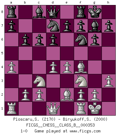 Last move : 1-0 2022 May 2 8:38:36 [Event "FICGS__CHESS__CLASS_B__000353"] [Site "FICGS"] [Date "2022.03.15"] [Round "1"] [White "Ploscaru,Stelian"] [Black "Biryukoff,Sergey"] [Result "1-0"] [WhiteElo "2170"] [BlackElo "2000"] 1.e4 d6 2.d4 g6 3.Nc3 Bg7 4.Nf3 Nf6 5.Be2 O-O 6.O-O c6 7.h3 Nbd7 8.a4 b6 9.Bf4 1-0 This chess game has been lost on time (started : 2022.03.15 10:11:20) King's pawn Opening Kingside Castling by player Black (move 5) Kingside Castling by player White (move 6) Player White won this chess game. Follow this game move after move (download)You cannot play at Chess if you are kind-hearted. (French Proverb) Ein Springer auf f6 gegen die eigene Rochadestellung ist schlimmer als ein rostiger Nagel im Knie. (Efim Bogoljubov) Creo que una cierta cantidad de temperamento es esperada de los genios del Ajedrez. (Ron Gross) Que feriez-vous si vous étiez en train de jouer aux échecs et que la fin du monde arrive ? Je continuerais à jouer. (Saint Borromée) Children in the dark cause accidents, accidents in the dark cause children. (Unknown)