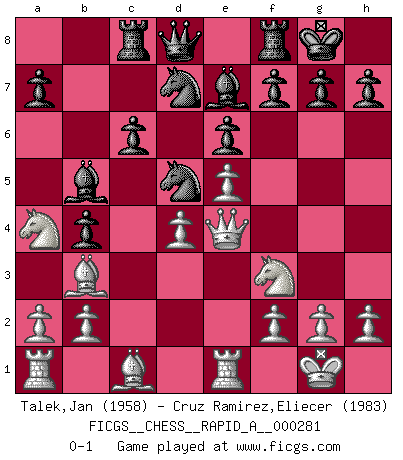 Last move : 0-1 2022 May 11 15:31:57 [Event "FICGS__CHESS__RAPID_A__000281"] [Site "FICGS"] [Date "2022.03.16"] [Round "1"] [White "Talek,Jan"] [Black "Cruz Ramirez,Eliecer"] [Result "0-1"] [WhiteElo "1958"] [BlackElo "1983"] 1.d4 d5 2.c4 c6 3.Nf3 Nf6 4.Nc3 e6 5.e3 Bd6 6.Bd3 Nbd7 7.e4 dxc4 8.Bxc4 b5 9.Bb3 b4 10.Na4 Be7 11.e5 Nd5 12.O-O Ba6 13.Re1 O-O 14.Qc2 Bb5 15.Qe4 Rc8 0-1 This chess game has been lost on time (started : 2022.03.16 21:24:10) QGD Slav : 4.Nc3 Kingside Castling by player White (move 12) Kingside Castling by player Black (move 13) Player Black won this chess game. Follow this game move after move (download)A good player is always lucky. (Jose Raul Capablanca) Im Fernschach kannst du während dem Spiel rauchen. (John Christen Knudsen) ¿Porque tengo que perder ante este idiota?. (Aron Nimzovich) Le pion, dans sa simplicité, marche droit devant lui, mais lorsqu'il prend, il le fait obliquement? Ainsi l'homme, tant qu'il reste pauvre, marche dans la droiture et vit honnêtement, mais lorsqu'il recherche les honneurs, il flatte, se parjure et, par les voies obliques, cherche une position supérieure sur l'échiquier du monde. (Jean de Galles) Ah, the Socrating method. The best way we have of teaching everything-apart from juggling chainsaws. (Gregory House, House M.D.)