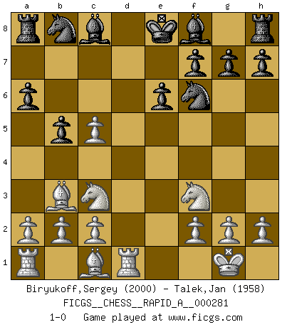 Last move : 1-0 2022 May 12 4:28:12 [Event "FICGS__CHESS__RAPID_A__000281"] [Site "FICGS"] [Date "2022.03.16"] [Round "1"] [White "Biryukoff,Sergey"] [Black "Talek,Jan"] [Result "1-0"] [WhiteElo "2000"] [BlackElo "1958"] 1.e4 d5 2.exd5 Qxd5 3.Nc3 Qd8 4.d4 Nf6 5.Nf3 e6 6.Bc4 a6 7.O-O b5 8.Bb3 c5 9.dxc5 Qxd1 10.Rxd1 1-0 This chess game has been lost on time (started : 2022.03.16 21:24:10) Scandinavian (centre counter) defense Kingside Castling by player White (move 7) Player White won this chess game. Follow this game move after move (download)Pawns: they are the soul of this game, they alone form the attack and defense. (Philidor) Ein Kibitz ist einer, der deinem Gegner gute Ratschläge gibt. (Andrew Soltis) El Ajedrez era la lengua materna de Capablanca. (Reti) Les Echecs représentent une sphère d'idées créatrices basée sur la volonté des deux protagonistes. (Smyslov) Hold em is to stud what chess is to checkers. (Johnny Moss)