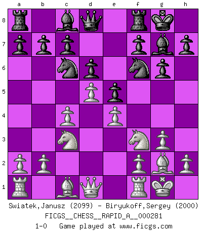 Last move : 1-0 2022 April 27 5:53:46 [Event "FICGS__CHESS__RAPID_A__000281"] [Site "FICGS"] [Date "2022.03.16"] [Round "1"] [White "Swiatek,Janusz"] [Black "Biryukoff,Sergey"] [Result "1-0"] [WhiteElo "2099"] [BlackElo "2000"] 1.d4 d6 2.Nf3 Nf6 3.c4 g6 4.g3 Bg7 5.Bg2 O-O 6.Nc3 e6 7.O-O Nc6 8.e4 e5 9.d5 1-0 This chess game has been lost on time (started : 2022.03.16 21:24:10) Queen's Pawn Kingside Castling by player Black (move 5) Kingside Castling by player White (move 7) Player White won this chess game. Follow this game move after move (download)Fischer, who may or may not be mad as a hatter, has every right to be horrified. (Jeremy Silman) Ich liebe den Moment, wenn ich das Ego meines Gegenüber breche. (Robert James Fischer) En el tablero, la mentira e hipocresía no sobreviven mucho. (Emanuel Lasker) A chaque perte on perd un peu de soi. (Joël Lautier) Treat your password like your toothbrush. Don't let anybody else use it, and get a new one every six months. (Clifford Stoll)