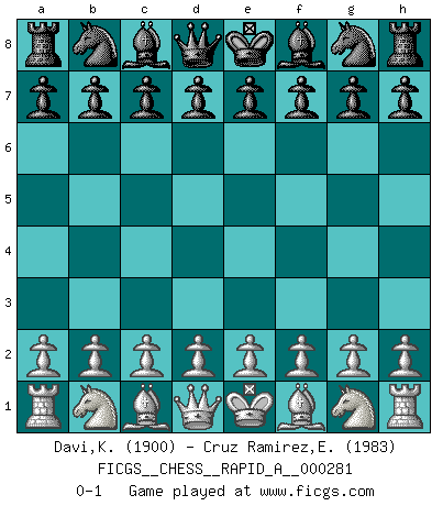 Last move : 0-1 2022 April 16 7:30:22 [Event "FICGS__CHESS__RAPID_A__000281"] [Site "FICGS"] [Date "2022.03.16"] [Round "1"] [White "Davi,Kanchan"] [Black "Cruz Ramirez,Eliecer"] [Result "0-1"] [WhiteElo "1900"] [BlackElo "1983"] 0-1 This chess game has been lost on time (started : 2022.03.16 21:24:10) Player Black won this chess game. Follow this game move after move (download)Though most people love to look at the games of the great attacking masters, some of the most successful players in history have been the quiet positional players. They slowly grind you down by taking away your space, tying up your pieces, and leaving you with virtually nothing to do ! (Yasser Seirawan) Frage des Reporters: -Welche besonderen Umstände rechtfertigen das Anhalten der Uhren während einer Turnierpartie? Antwort: -Einen Fotographen zu strangulieren. (Siegbert Tarrasch) La esencia del Ajedrez es pensar acerca de lo que el Ajedrez es. (David Bronstein) Le succès, c'est être capable d'aller d'échec en échec sans perdre son enthousiasme. (Winston Churchill) When you have everything, sometimes it feels like nothing. (Horatio Caine, C.S.I. Miami)