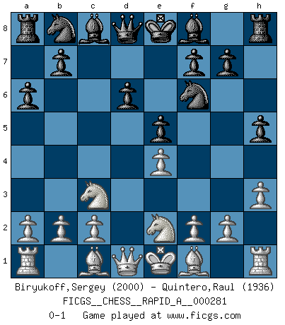 Last move : 0-1 2022 April 30 2:2:56 [Event "FICGS__CHESS__RAPID_A__000281"] [Site "FICGS"] [Date "2022.03.16"] [Round "1"] [White "Biryukoff,Sergey"] [Black "Quintero,Raul"] [Result "0-1"] [WhiteElo "2000"] [BlackElo "1936"] 1.e4 c5 2.Nf3 d6 3.d4 cxd4 4.Nxd4 Nf6 5.Nc3 a6 6.h3 e5 7.Nde2 h5 0-1 This chess game has been lost on time (started : 2022.03.16 21:24:10) Sicilian : Najdorf, Adams attack Player Black won this chess game. Follow this game move after move (download)Not only will I predict his triumph over Botvinnik, but I'll go further and say that he'll probably be the greatest Chess player that ever lived. (John Collins) Das typische an einem Großmeister ist, daß er eine gewonnene Position schnell und schmerzlos gewinnt. (Irving Chernev) Los Peones son nacidos libres, y aún así, se encuentran encadenados por todos lados. (Rick Kennedy) Le moment que je préfère le plus dans une rencontre, c'est celui où je sens que la personnalité de l'adversaire se brise. (Robert Fischer) Now you put water in a cup, it becomes the cup; You put water into a bottle it becomes the bottle; You put it in a teapot it becomes the teapot. Water can flow or it can crash. Be water, my friend. (Bruce Lee)
