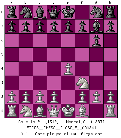 Last move : 0-1 2022 April 30 2:2:56 [Event "FICGS__CHESS__CLASS_E__000241"] [Site "FICGS"] [Date "2022.03.17"] [Round "1"] [White "Goletto,Piero Giuseppe"] [Black "Marcel,Alexis"] [Result "0-1"] [WhiteElo "1512"] [BlackElo "1237"] 1.e4 g6 2.Nf3 Bg7 0-1 This chess game has been lost on time (started : 2022.03.17 20:16:56) Robatsch (Modern) defense Player Black won this chess game. Follow this game move after move (download)Discovered check is the dive bomber of the Chessboard. (Reuben Fine) Obwohl ich alt bin, darf mir niemand den Finger in den Mund stecken, sonst beisse ich. (Wilhelm Steinitz) Yo tuve un dolor de muelas en la primer partida. En el segundo juego, tuve un dolor de cabeza. En el tercero, tuve un ataque de reumatísmo. En la cuarta partida, no me sentía muy bien. ¿Y en el quinto juego? Bueno, ¿que acaso uno tiene que ganar todos los juegos?. (Siegbert Tarrasch) Même un GMI sait rarement calculer sur plus de cinq coups une attaque à sacrifices. (Rudolf Spielmann) A good book on your shelf is a friend that turns its back on you and remains a friend. (Author unknown)