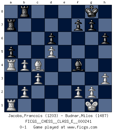 Last move : 0-1 2022 June 2 18:43:54 [Event "FICGS__CHESS__CLASS_E__000241"] [Site "FICGS"] [Date "2022.03.17"] [Round "1"] [White "Jacobs,Francois"] [Black "Budnar,Milos"] [Result "0-1"] [WhiteElo "1203"] [BlackElo "1487"] 1.e4 c5 2.Nf3 d6 3.d4 cxd4 4.Nxd4 Nf6 5.Nc3 a6 6.h3 e5 7.Nb3 h6 8.Be2 Be7 9.O-O O-O 10.Be3 Be6 11.Qd2 Nc6 12.Rad1 Bxb3 13.axb3 b5 14.Bf3 b4 15.Nd5 Nxd5 16.exd5 Nd4 17.Bxd4 exd4 18.Qxd4 Bf6 19.Qxb4 Be5 20.c3 Rb8 21.Qc4 Qf6 22.Be2 Qf4 23.Qxf4 Bxf4 24.Bc4 a5 25.Ra1 Ra8 26.Ra4 Ra7 27.b4 Rfa8 28.Rfa1 Rab8 0-1 Sicilian : Najdorf, Adams attack Kingside Castling by player White (move 9) Kingside Castling by player Black (move 9) Player Black won this chess game. Follow this game move after move (download)The hardest game to win is a won game. (Emanuel Lasker) Privat ist Kortschnoi kein schlechter Mensch, sehr sympathisch. Aber während des Spiels ist er grausam. Er will dich töten. (Miguel Najdorf) Las piezas de Ajedrez son los bloques del alfabeto que moldean los pensamientos; y esos pensamientos, aunque hagan un diseño visual en el tablero, expresan abstractamente su belleza como un poema. (Marcel Duchamp) Aux échecs, l'amour-propre est satisfait quand on remporte la victoire, mais il n'y a pas de honte à être battu. (Benjamin Franklin) You think that education is too expensive ? Try ignorance. (Derek Bok)