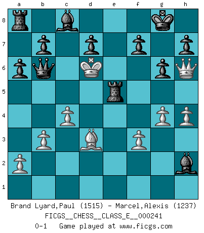Last move : 0-1 2022 April 13 7:47:25 [Event "FICGS__CHESS__CLASS_E__000241"] [Site "FICGS"] [Date "2022.03.17"] [Round "1"] [White "Brand Lyard,Paul"] [Black "Marcel,Alexis"] [Result "0-1"] [WhiteElo "1515"] [BlackElo "1237"] 1.e4 g6 2.d4 Bg7 3.Nf3 c5 4.dxc5 Qa5+ 5.Qd2 Qxc5 6.Be2 Qb6 7.b3 Bxa1 8.Bc4 Bg7 9.O-O Nc6 10.Qf4 e6 11.Nc3 a6 12.Be3 Qd8 13.Rd1 Nf6 14.Nd5 exd5 15.exd5 Ne7 16.Bd4 Nf5 17.Bxf6 Bxf6 18.g4 Nh4 19.Nxh4 Bxh4 20.d6 O-O 21.Qh6 Bf6 22.Rd4 Bxd4 23.Bd3 Qb6 24.Kg2 Qxd6 25.h4 Qd5+ 26.f3 Qc5 27.c4 Bg1 28.Kg3 Qf2+ 29.Kf4 Bh2+ 30.Ke4 Re8+ 31.Kd5 Re5+ 32.Kd6 Qb6+ 0-1 Robatsch (Modern) defense Kingside Castling by player White (move 9) Kingside Castling by player Black (move 20) Player Black won this chess game. Follow this game move after move (download)It is peculiar but a fact nevertheless, that gamblers in chess always have enthusiastic followers. (Botvinnik) Ich verstehe den Grund nicht, warum die Aufteilung in Frauen und Männer überhaupt im Schach besteht. (Judith Polgar) Los asuntos humanos son como una partida de Ajedrez: solo aquellos que no lo toman seriamente, pueden ser llamados buenos jugadores. (Hung Tzu Ch'eng) Mon pion favori sur ma case favorite ! Bronstein en parlant d'un coup de pion en h5 quand il avait les Noirs. You can think I'm wrong, but that's no reason to quit thinking. (Gregory House, House M.D.)