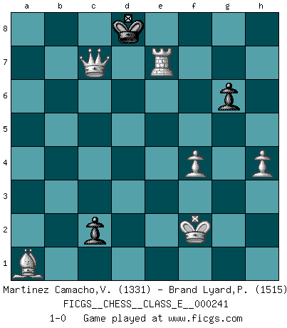 Last move : 1-0 2022 June 5 17:31:56 [Event "FICGS__CHESS__CLASS_E__000241"] [Site "FICGS"] [Date "2022.03.17"] [Round "1"] [White "Martinez Camacho,Victor Hugo"] [Black "Brand Lyard,Paul"] [Result "1-0"] [WhiteElo "1331"] [BlackElo "1515"] 1.e4 e5 2.Nf3 Nc6 3.Bb5 d6 4.h3 Nf6 5.d4 Nxe4 6.dxe5 dxe5 7.Qxd8+ Kxd8 8.O-O f5 9.Rd1+ Bd7 10.Bxc6 bxc6 11.Nxe5 Bd6 12.Nxd7 Kxd7 13.Nd2 Nxd2 14.Bxd2 Rhe8 15.Kf1 c5 16.Re1 Rxe1+ 17.Rxe1 a5 18.a4 h5 19.b3 Bh2 20.g3 h4 21.Kg2 Rh8 22.Kxh2 hxg3+ 23.fxg3 Ra8 24.Re5 g6 25.Rxc5 c6 26.Bxa5 Re8 27.Kg2 Re2+ 28.Kf3 Rh2 29.h4 Rh1 30.Re5 Rf1+ 31.Kg2 Rd1 32.Re2 Ra1 33.Bc3 Rd1 34.a5 Rd5 35.Kf2 Rd1 36.a6 Ra1 37.Bxa1 c5 38.a7 f4 39.gxf4 Kc7 40.a8Q c4 41.Re6 cxb3 42.Qa7+ Kd8 43.Re7 bxc2 44.Qc7+ 1-0 Ruy Lopez : Old Steinitz defense Kingside Castling by player White (move 8) Promotion Queen by player White (move 40) 10 pieces endgame at move 41 : White KQRBPPP , Black KPP WHITE : King + 1 Queen 1 Rook 1 Bishop 3 Pawns BLACK : King + 2 Pawns 9 pieces endgame at move 43 : White KQRBPP , Black KPP WHITE : King + 1 Queen 1 Rook 1 Bishop 2 Pawns BLACK : King + 2 Pawns Player White won this chess game. Follow this game move after move (download)With or without the title, Bobby Fischer was unquestionably the greatest player of his time. (Burt Hochberg) In der Schule lernt man nichts. Es ist nur Zeitverschwendung. (Robert James Fischer) Un mal plan es mejor que no tener ningún plan. (Frank Marshall) Tous ces prétendus hommes politiques sont les pions, les Cavaliers, les Tours ou les Fous d'une partie d'échecs qui se jouera tant qu'un hasard ne renversera pas l'échiquier. (Honoré de Balzac) A generalist learns less and less about more and more until he knows nothing about everything. (Author unknown)