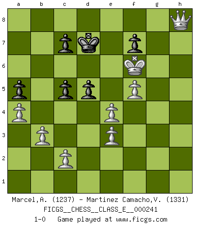 Last move : 1-0 2022 August 17 15:45:49 [Event "FICGS__CHESS__CLASS_E__000241"] [Site "FICGS"] [Date "2022.03.17"] [Round "1"] [White "Marcel,Alexis"] [Black "Martinez Camacho,Victor Hugo"] [Result "1-0"] [WhiteElo "1237"] [BlackElo "1331"] 1.f4 Nf6 2.Nf3 Nc6 3.e3 d5 4.b3 Bf5 5.Bb2 e6 6.Be2 Be7 7.O-O Nb4 8.Nd4 Bg6 9.a3 Nc6 10.Nxc6 bxc6 11.Nc3 Ne4 12.Nxe4 Bxe4 13.d3 Bg6 14.Bxg7 Rg8 15.Bb2 a5 16.g3 h5 17.Bxh5 c5 18.Be5 Bf6 19.Kg2 Bxe5 20.fxe5 Qg5 21.Bxg6 Rxg6 22.Qf3 Rg7 23.Qf6 Qxf6 24.exf6 Rg6 25.Rf3 Kd7 26.a4 Rh8 27.Raf1 Rgh6 28.h4 Rg8 29.Kh3 R8g6 30.g4 e5 31.h5 Rg5 32.Rf5 Rxf5 33.Rxf5 Ke6 34.Kh4 Rxf6 35.Kg5 Rxf5+ 36.gxf5+ Ke7 37.h6 Kf8 38.Kf6 e4 39.h7 Ke8 40.h8Q+ Kd7 41.dxe4 1-0 Bird's Opening Kingside Castling by player White (move 7) Promotion Queen by player White (move 40) Player White won this chess game. Follow this game move after move (download)A thorough understanding of the typical mating continuations makes the most complicated sacrificial combinations leading up to them not only not difficult, but almost a matter of course. (Siegbert Tarrasch) Zu meiner Zeit war ein 20 jähriger ein junger Spieler, heute ist er ein Veteran. (Garry Kasparov) En partidas rápidas, el Caballo es mas poderoso que el Alfil. (Vlastimil Hort) Le thème de l'attaque double intervient d'une manière ou d'une autre dans l'immense majorité des combinaisons. (Youri Averbakh) When you stop learning you start dying. (M. Scott Adams)