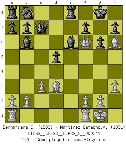 Last move : 1-0 2022 June 5 17:31:47 [Event "FICGS__CHESS__CLASS_E__000241"] [Site "FICGS"] [Date "2022.03.17"] [Round "1"] [White "Bernardara,Enos"] [Black "Martinez Camacho,Victor Hugo"] [Result "1-0"] [WhiteElo "1583"] [BlackElo "1331"] 1.d4 Nf6 2.Nc3 e6 3.e4 c5 4.Nf3 cxd4 5.Nxd4 Bc5 6.Bd3 Bxd4 7.h3 Qc7 8.Bd2 O-O 9.O-O d5 10.exd5 Nxd5 11.Nxd5 exd5 12.c3 Bb6 13.Qh5 g6 14.Qf3 Be6 15.Bh6 Re8 16.Qf6 1-0 Queen's pawn game Kingside Castling by player Black (move 8) Kingside Castling by player White (move 9) Player White won this chess game. Follow this game move after move (download)Chess demands total concentration. (Bobby Fischer) Im Schach gewinnt jeder. Hat man Freunde am Spiel - und das ist die Hauptsache - ist auch der Verlust einer Partie kein Unglück. (David Bronstein) El Ajedrez demanda una total concentración. (Bobby Fischer) La tactique, c'est ce que vous faites quand il y a quelque chose à faire; la stratégie, c'est ce que vous faites quand il n'y a rien à faire. (Savielli Tartacower) I believe in luck. How else can you explain the success of those you dislike ? (Jean Cocteau)