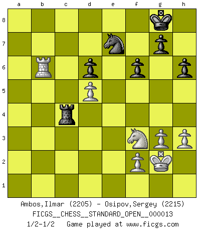 Last move : 1/2-1/2 2022 April 3 9:0:33 [Event "FICGS__CHESS__STANDARD_OPEN__000013"] [Site "FICGS"] [Date "2022.03.19"] [Round "1"] [White "Ambos,Ilmar"] [Black "Osipov,Sergey"] [Result "1/2-1/2"] [WhiteElo "2205"] [BlackElo "2215"] 1.d4 Nf6 2.c4 e6 3.Nf3 b6 4.Nc3 Bb7 5.g3 Bb4 6.Bg2 Bxc3+ 7.bxc3 d6 8.Bg5 Nbd7 9.O-O O-O 10.Re1 h6 11.Bxf6 Nxf6 12.Nd2 Bxg2 13.Kxg2 c5 14.e4 cxd4 15.cxd4 Rc8 16.a4 Nd7 17.Ra3 Nb8 18.a5 bxa5 19.Qa4 Nc6 20.d5 Nd4 21.Rb1 exd5 22.exd5 Qg5 23.Qxa5 Rfe8 24.Rb2 Nf5 25.Nf3 Qg4 26.Qa4 Qxc4 27.Qxc4 Rxc4 28.Rxa7 f6 29.h3 Re7 30.Rxe7 Nxe7 31.Rb6 1/2-1/2 Queen's Indian : 4.Nc3 Kingside Castling by player White (move 9) Kingside Castling by player Black (move 9) This chess game ended in a draw. Follow this game move after move (download)What would Chess be without silly mistakes ? (Kurt Richter) Alle offensichtlichen Züge sehen nach dem Spiel in der Analyse verdächtig aus. (Viktor Kortschnoi) Un mal plan es mejor que no tener ningún plan. (Frank Marshall) A ce moment-là, je menaçais de comprendre la position ! (Clément L'Heureux) Now you put water in a cup, it becomes the cup; You put water into a bottle it becomes the bottle; You put it in a teapot it becomes the teapot. Water can flow or it can crash. Be water, my friend. (Bruce Lee)