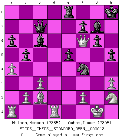Last move : 0-1 2022 April 11 16:38:34 [Event "FICGS__CHESS__STANDARD_OPEN__000013"] [Site "FICGS"] [Date "2022.03.19"] [Round "1"] [White "Wilson,Norman"] [Black "Ambos,Ilmar"] [Result "0-1"] [WhiteElo "2255"] [BlackElo "2205"] 1.e4 e5 2.Nf3 Nc6 3.Bb5 a6 4.Ba4 Nf6 5.O-O Be7 6.Re1 b5 7.Bb3 d6 8.c3 O-O 9.h3 Nb8 10.d4 Nbd7 11.Nbd2 Bb7 12.Bc2 Re8 13.Nf1 Bf8 14.d5 c6 15.dxc6 Bxc6 16.Ng3 Qc7 17.Bg5 h6 18.Bxf6 Nxf6 19.Nh2 d5 20.exd5 Nxd5 21.Qg4 Nf4 22.Nh5 Nxg2 23.Nf6+ Kh8 24.Nxe8 Rxe8 25.Red1 Nf4 26.a4 h5 27.Qf5 g6 28.Qf6+ Bg7 0-1 Ruy Lopez : Closed Kingside Castling by player White (move 5) Kingside Castling by player Black (move 8) Player Black won this chess game. Follow this game move after move (download)The Chess pieces are the block alphabet which shapes thoughts; and these thoughts, although making a visual design on the chessboard, express their beauty abstractly, like a poem. (Marcel Duchamp) Ich organisiere ein großes Turnier, was mich etwa 120000 Dollar kostet. Ich denke, das ist das erste Mal in der Schachgeschichte, daß ein Schachgroßmeister auch als Mäzen auftritt. (Miguel Najdorf) ¡Examina movidas que hagan daño! Un buen ojo for movidas desvastantes es mucho mas importante que el conocimiento de principios estratégicos. (Purdy) Les échecs, c'est l'art d'analyser. (Mikhail Botvinnik) Life is painting a picture, not doing a sum. (Oliver Wendell Holmes, Jr.)
