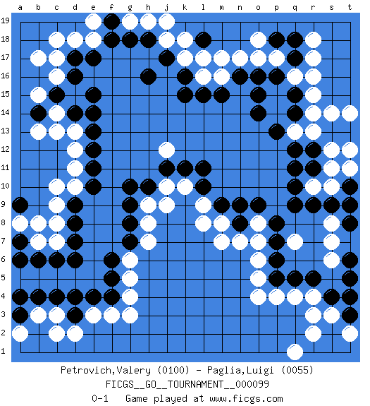 Last move : 0-1 2022 April 16 18:12:6 [Event "FICGS__GO__TOURNAMENT__000099"] [Site "FICGS"] [Date "2022.03.23"] [Round "1"] [Black "Petrovich,Valery"] [White "Paglia,Luigi"] [Result "0-1"] [Rating 1 "0100"] [Rating 2 "0055"] 1.d4 q4 2.d16 q16 3.o15 d10 4.q10 r13 5.p13 q7 6.p8 k10 7.l11 j12 8.k16 d13 9.e14 c17 10.d17 c16 11.c15 c14 12.d14 b15 13.e13 c13 14.e12 o7 15.p7 o5 16.p6 o6 17.p5 p4 18.q5 o4 19.o9 n17 20.o16 o17 21.n16 g4 22.f5 g5 23.f6 c7 24.d6 g6 25.g7 h7 26.g8 h8 27.g9 h9 28.g10 k18 29.j17 r4 30.r5 s10 31.s4 s3 32.t5 r3 33.t3 e3 34.e4 f3 35.f4 g3 36.e10 d11 37.e11 d12 38.d9 c9 39.d7 c8 40.d8 c3 41.d3 d2 42.c6 c2 43.c4 b7 44.b6 b3 45.b4 l8 46.l10 l9 47.m9 m8 48.n8 n7 49.k11 j10 50.j11 r10 51.q9 s6 52.t6 s7 53.t8 s8 54.s9 t9 55.t10 t11 56.r9 s11 57.t9 r17 58.q11 d18 59.e17 e18 60.e15 b17 61.a7 c10 62.f18 g19 63.g18 h19 64.h18 j18 65.f19 k17 66.h16 l16 67.k15 m16 68.m15 m17 69.l15 c18 70.q12 q13 71.q14 r14 72.q15 r15 73.p16 p17 74.o14 j19 75.h10 j9 76.s2 r2 77.r1 q1 78.s1 t2 79.t1 t2 80.t4 a8 81.a6 o8 82.n9 m7 83.a3 a2 84.a4 e19 85.r12 s12 86.q18 r18 87.q17 r16 88.p18 o18 89.l18 l17 90.s13 s14 91.t13 t14 92.r11 t12 93.a9 b8 94.b14 b13 0-1 Here are the names of the openings (joseki) played in the four corners : Corner q16 : q16 o15 Hoshi (Hwajeom, Seongjeom, Xingwei`) 4-4 Point. The star or hoshi (4-4) point, emphasizing influence at the potential expense of territory. Corner d16 : d16 j12 Hoshi (Hwajeom, Seongjeom, Xingwei`) 4-4 Point. The star or hoshi (4-4) point, emphasizing influence at the potential expense of territory. Corner d4 : d4 g4 Hoshi (Hwajeom, Seongjeom, Xingwei`) 4-4 Point. The star or hoshi (4-4) point, emphasizing influence at the potential expense of territory. Niken Takagakari (Dukan Nop'dakeolch'im, E`r Gaojia, 2-Space High Approach). White 2 is a light approach move. Rarely played in even games, White 2 is typically employed in handicap games. Black continues with 6-4 or 3-10. In Korean Sunjang Baduk Black has a stone on 8-4. Player White won this Go (weiqi, baduk) game. Follow this game move after move (download)In the opening, when you don't know what to play, make a shimari. (Jansteen) Perhaps chess is the wrong game for the times (The Chess Master and the Computer, by Garry Kasparov - 2010)
