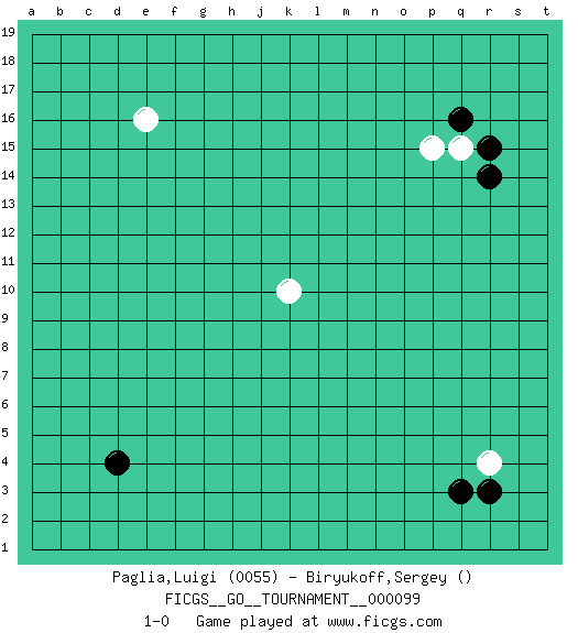 Last move : 1-0 2022 April 27 18:15:17 [Event "FICGS__GO__TOURNAMENT__000099"] [Site "FICGS"] [Date "2022.03.23"] [Round "1"] [Black "Paglia,Luigi"] [White "Biryukoff,Sergey"] [Result "1-0"] [Rating 1 "0055"] 1.q16 k10 2.d4 e16 3.r3 r4 4.q3 p15 5.r14 q15 6.r15 1-0 This go game has been lost on time (started : 2022.03.23 7:39:57) Here are the names of the openings (joseki) played in the four corners : Corner q4 : r3 r4 San-San (Sam-Sam, San-San) 3-3 Point. The San-San (3-3) point, emphasizing territory at the expense of influence. This move is not recommended. White should envisage 4-4, 5-3, 6-4, 5-4 or 6-3 instead. Corner q16 : q16 p15 Hoshi (Hwajeom, Seongjeom, Xingwei`) 4-4 Point. The star or hoshi (4-4) point, emphasizing influence at the potential expense of territory. Player Black won this Go (weiqi, baduk) game. Follow this game move after move (download)There is no territory in the centre. (Anonymous) Macintosh - we might not get everything right, but at least we knew the century was going to end. (Douglas Adams)