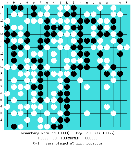 Last move : 0-1 2022 September 15 23:51:58 [Event "FICGS__GO__TOURNAMENT__000099"] [Site "FICGS"] [Date "2022.03.23"] [Round "1"] [Black "Greenberg,Normund"] [White "Paglia,Luigi"] [Result "0-1"] [Rating 1 "0000"] [Rating 2 "0055"] 1.k4 d4 2.d3 f4 3.d5 c3 4.e4 c4 5.g4 e3 6.f3 e5 7.e2 d2 8.d1 c1 9.e1 d10 10.f5 e6 11.e7 g3 12.h3 f2 13.b1 f1 14.g2 q4 15.d6 k10 16.f6 e4 17.b4 b3 18.d9 e10 19.c10 e9 20.f10 e8 21.f8 d7 22.f7 d8 23.c5 b5 24.b6 c6 25.c8 c9 26.b9 d9 27.e11 b8 28.a5 a4 29.f9 d11 30.d12 c12 31.c13 e12 32.f11 d13 33.a8 c7 34.b12 b10 35.a9 a10 36.a7 b7 37.b11 a6 38.l10 k11 39.k12 l11 40.m10 l12 41.l13 k13 42.j12 j13 43.m13 k9 44.h13 j15 45.k8 g13 46.g14 h12 47.j11 h11 48.j10 h9 49.h10 g10 50.g9 j9 51.f13 h14 52.g15 f12 53.f14 h4 54.f3 g5 55.g3 h5 56.j5 h6 57.j6 j7 58.k7 j8 59.k6 j3 60.j2 h2 61.h1 g1 62.k15 q17 63.k3 h2 64.k2 r3 65.j16 d17 66.k14 k16 67.l16 k17 68.h15 j14 69.k18 j17 70.h16 h17 71.g17 l17 72.l18 l15 73.m16 l14 74.d14 c14 75.b13 b14 76.d15 c16 77.b15 c15 78.a14 b16 79.a15 f17 80.h18 g18 81.g16 f18 82.m17 k15 83.m15 j18 84.h19 g19 85.j19 k19 86.k5 r15 87.l19 j19 88.n14 q10 89.e18 e17 90.e19 c18 91.c19 b18 92.b19 n3 93.m12 m11 94.n10 q7 95.n11 n18 96.n17 o18 97.n12 q13 98.l9 n7 99.j1 g3 100.p18 p17 101.q18 r18 102.r17 s18 103.o17 p19 104.q19 r19 105.a16 a17 106.r16 q16 107.s15 r14 108.s14 s13 109.s12 t13 110.p16 o16 111.p15 p14 112.o14 o15 113.m14 o13 114.p12 p13 115.q15 m8 116.q9 r9 117.r10 q11 118.s9 r8 119.p10 p11 0-1 This go game has been lost on time (started : 2022.03.23 7:39:57) Here are the names of the openings (joseki) played in the four corners : Corner d4 : d4 d3 Hoshi (Hwajeom, Seongjeom, Xingwei`) 4-4 Point. The star or hoshi (4-4) point, emphasizing influence at the potential expense of territory. Corner d16 : e11 d11 This joseki is unknown. A weak or weird move has probably been played in this corner. Player White won this Go (weiqi, baduk) game. Follow this game move after move (download)Don't make empty triangles. (Anonymous) Programming can only do so much before it becomes too much. (Don Groves)