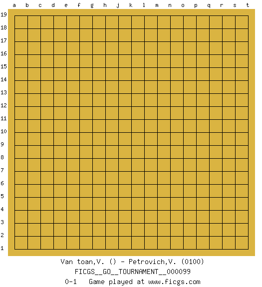 Last move : 0-1 2022 April 22 19:42:32 [Event "FICGS__GO__TOURNAMENT__000099"] [Site "FICGS"] [Date "2022.03.23"] [Round "1"] [Black "Van toan,Van toan"] [White "Petrovich,Valery"] [Result "0-1"] [Rating 2 "0100"] 0-1 This go game has been lost on time (started : 2022.03.23 7:39:57) Here are the names of the openings (joseki) played in the four corners : Player White won this Go (weiqi, baduk) game. Follow this game move after move (download)In the sound of the stone you can hear its purpose. (Pierre Audouard) Without deviation from the norm, progress is not possible. (Frank Zappa)