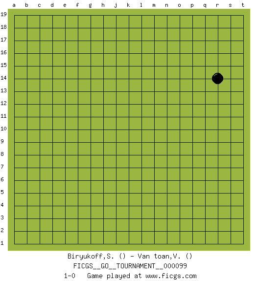 Last move : 1-0 2022 April 22 19:42:32 [Event "FICGS__GO__TOURNAMENT__000099"] [Site "FICGS"] [Date "2022.03.23"] [Round "1"] [Black "Biryukoff,Sergey"] [White "Van toan,Van toan"] [Result "1-0"] 1.r14 1-0 This go game has been lost on time (started : 2022.03.23 7:39:57) Here are the names of the openings (joseki) played in the four corners : Player Black won this Go (weiqi, baduk) game. Follow this game move after move (download)A few moments to learn, a lifetime to master. (Ancient proverb) It's only after you lost everything, Tyler says, that you're free to do anything. (Chuck Palahniuk, Fight Club)