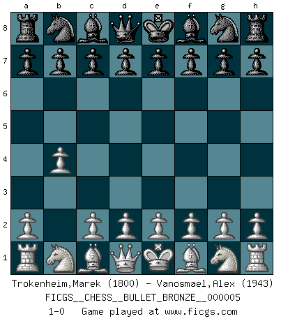 Last move : 1-0 2008 March 13 12:59:31 [Event "FICGS__CHESS__BULLET_BRONZE__000005"] [Site "FICGS"] [Date "2008.03.13"] [Round "1"] [White "Trokenheim,Marek"] [Black "Vanosmael,Alex"] [Result "1-0"] [WhiteElo "1800"] [BlackElo "1943"] 1.b4 1-0 This chess game has been lost on time (started : 2008.03.13 12:25:25) Polish (Sokolsky) opening Player White won this chess game. Follow this game move after move (download)You know, comrade Pachman, I don't enjoy being a Minister, I would rather play Chess like you. (Che Guevara) Ich habe die Schachforschung dermaßen betrieben, dass sie auf eine wissenschaftliche Basis gestellt wurde. (Mikhail Moiseyevich Botvinik) El ganador de una partida es aquel jugador que hace el penúltimo error. (Savielly Tartakover) Des idées, des idées, j'en ai cent, j'en ai mille. Des bonnes, des mauvaises, applicables, irréalisables... Il suffit de faire le tri ! (Roos) Life is pain my dear and anyone who says otherwise is selling something. (Princess Bride)