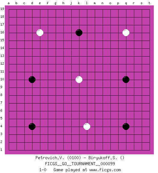 Last move : 1-0 2022 April 27 5:53:46 [Event "FICGS__GO__TOURNAMENT__000099"] [Site "FICGS"] [Date "2022.03.23"] [Round "1"] [Black "Petrovich,Valery"] [White "Biryukoff,Sergey"] [Result "1-0"] [Rating 1 "0100"] 1.d4 q16 2.q4 e16 3.k16 l4 4.q10 k10 5.d10 1-0 This go game has been lost on time (started : 2022.03.23 7:39:57) Here are the names of the openings (joseki) played in the four corners : Corner q4 : q4 l4 Hoshi (Hwajeom, Seongjeom, Xingwei`) 4-4 Point. The star or hoshi (4-4) point, emphasizing influence at the potential expense of territory. Corner d4 : d4 1-0 Hoshi (Hwajeom, Seongjeom, Xingwei`) 4-4 Point. The star or hoshi (4-4) point, emphasizing influence at the potential expense of territory. Player Black won this Go (weiqi, baduk) game. Follow this game move after move (download)If you lose by one point, take a rest. (Anonymous) Yoga is 99% practice and 1% knowledge. (Sri Krishna Pattabhi Jois)